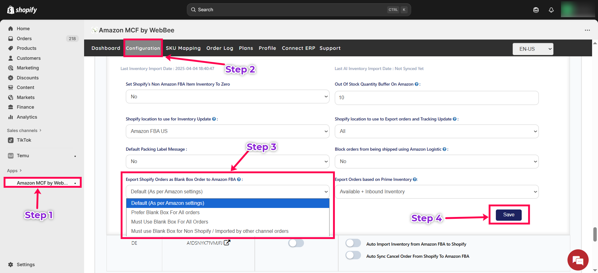 Inventory Update from Amazon FBA active products to Shopify Products via Amazon MCF by WebBee APP