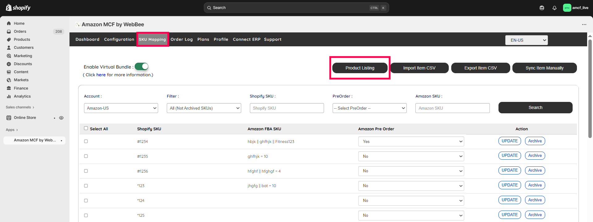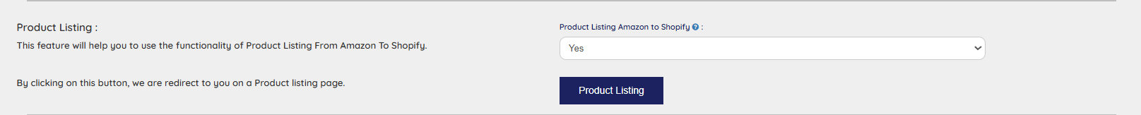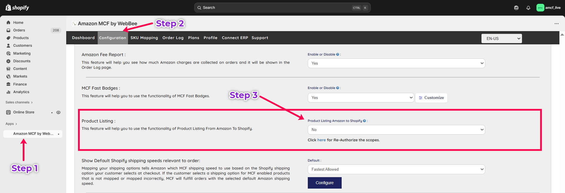 Open Amazon-MCF by WebBee app in your Shopify admin account > click on the configuration tab > In the app setting search for product listing feature, & select the drop-down value as "Yes".
