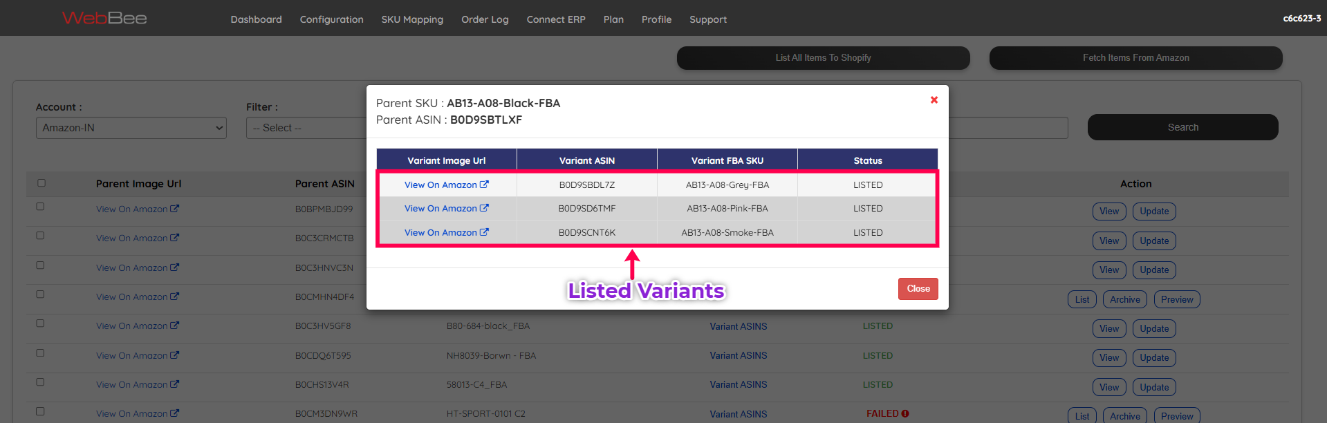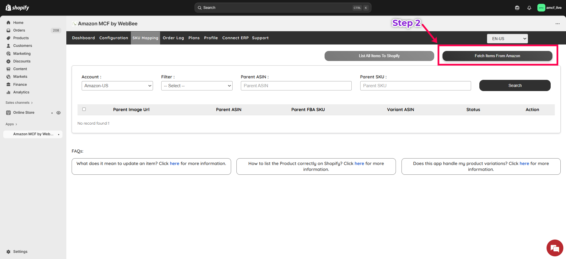 The product listing feature offered by WebBee AMCF Shopify connects Amazon MCF to your Shopify store. It helps you to list all your active Amazon-listed products (FBA) to your Shopify store in just a single click. Please make sure that your plan supports the product listing feature.