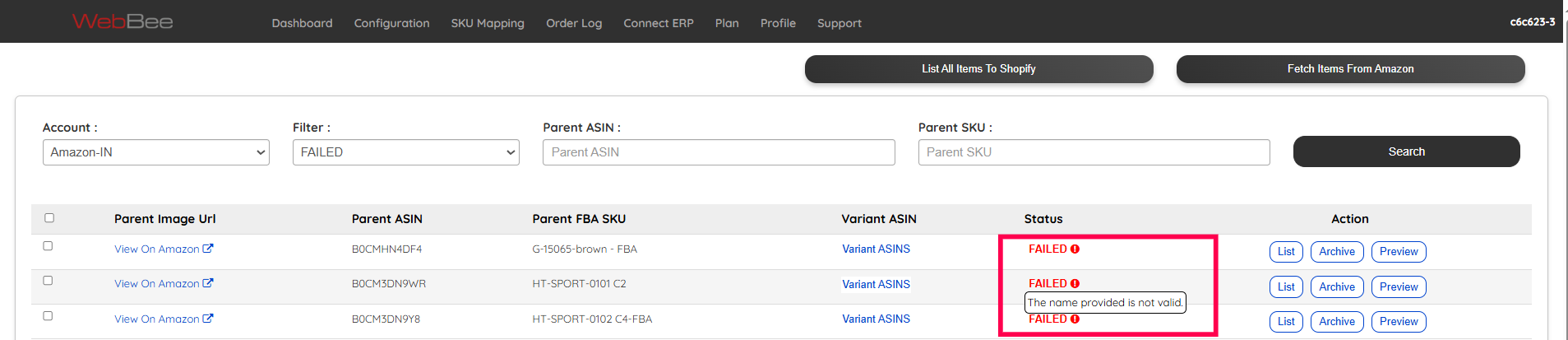 Note: If you encounter any issues while listing the product in your Shopify store, a failed status will appear for that product, along with a tooltip explaining the reason for the failure in the WebBee app.