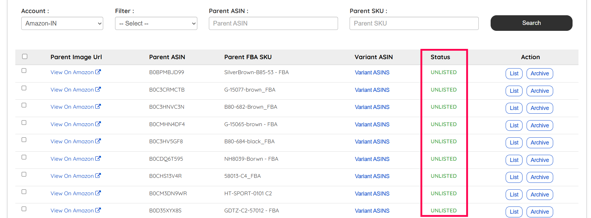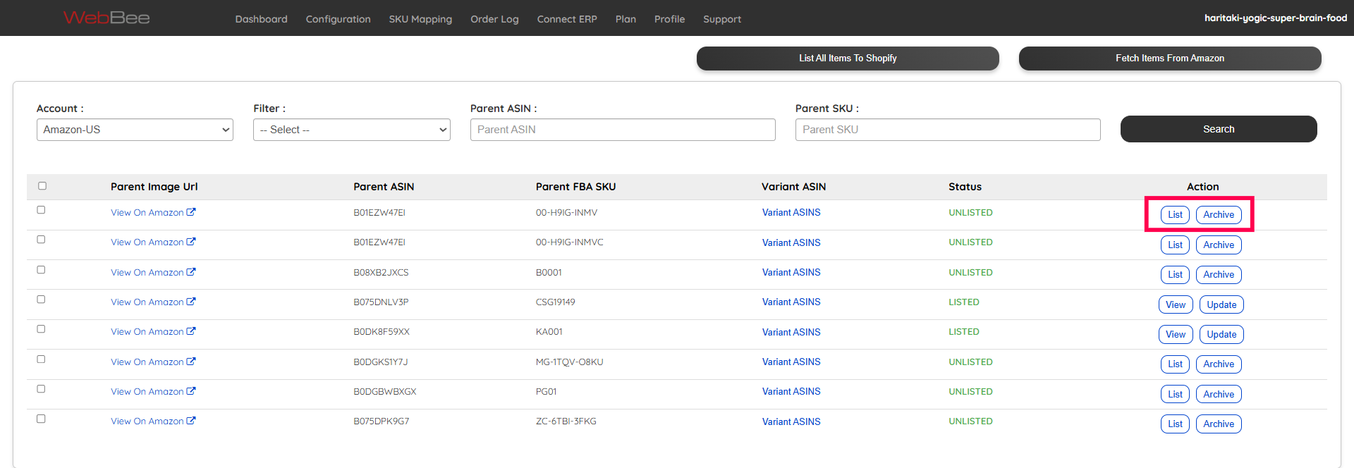 To list all your products at a single time, click on the "List All Items to Shopify" button. If you want to list a single product, click the List button located in the action column next to the respective product. Additionally, if you want to mark a product as "inactive" in our app, click the "Archive" button.