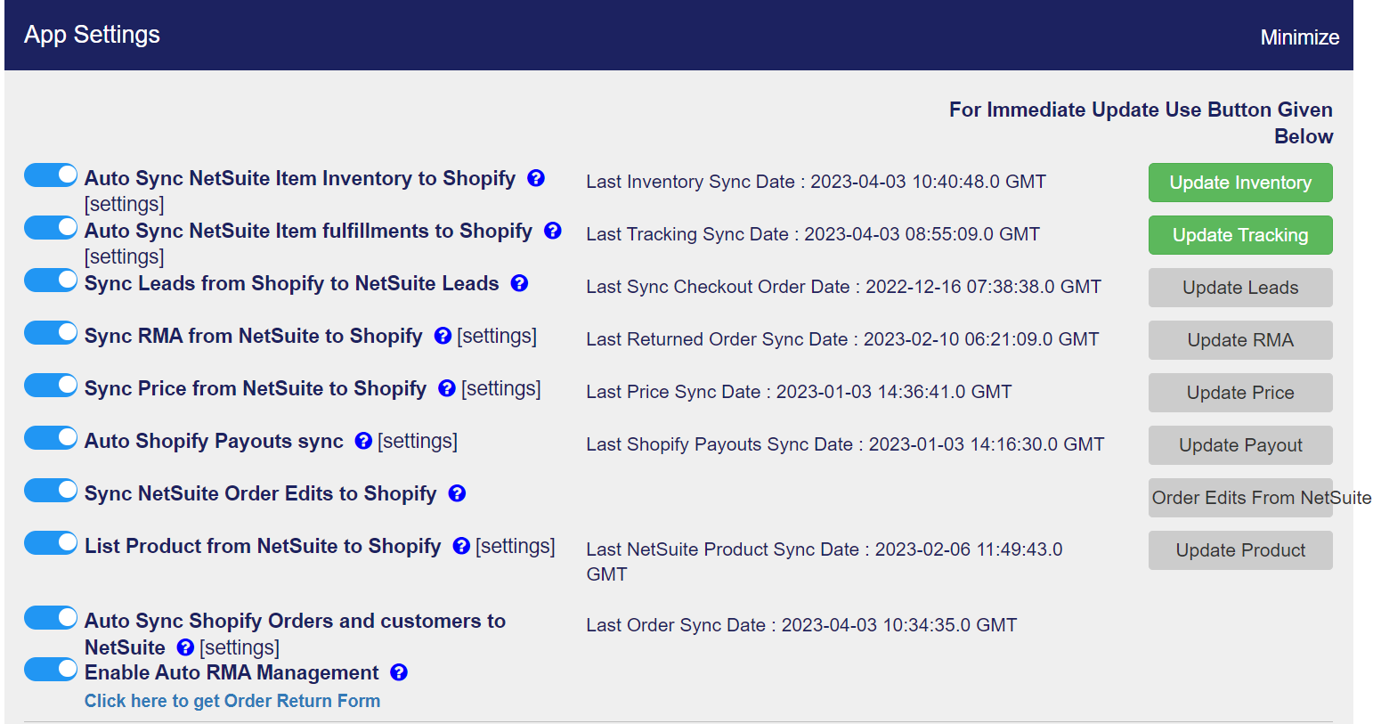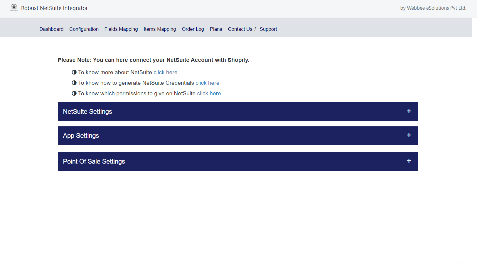 This section contains all the settings OR standard workflows that are related to your NetSuite account & Shopify store.