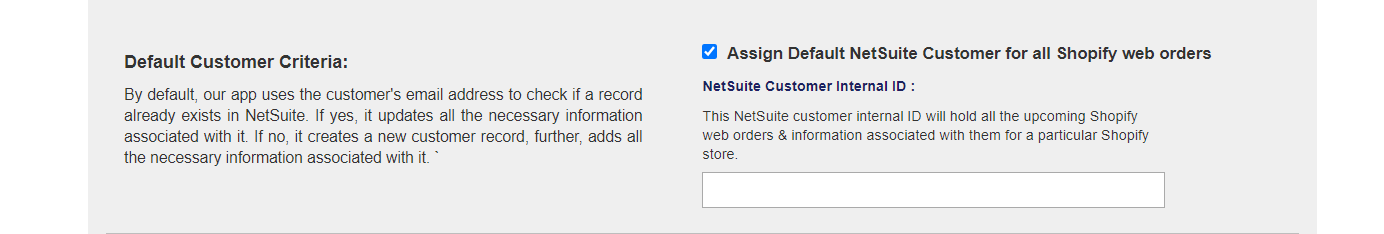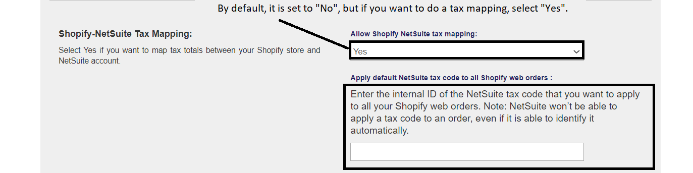 By default, it is set to No, but select Yes if you want to map tax totals between your Shopify store and NetSuite account. If you select, Yes you need to enter the internal ID of a NetSuite tax code that you want to apply to all your Shopify web orders. Note: NetSuite won’t be able to apply a tax code to an order, even if it is able to identify it automatically.