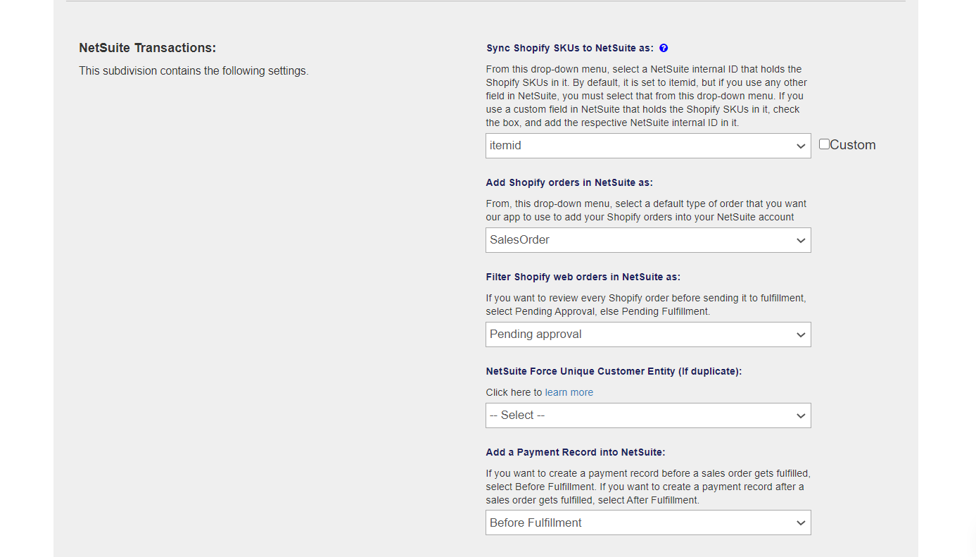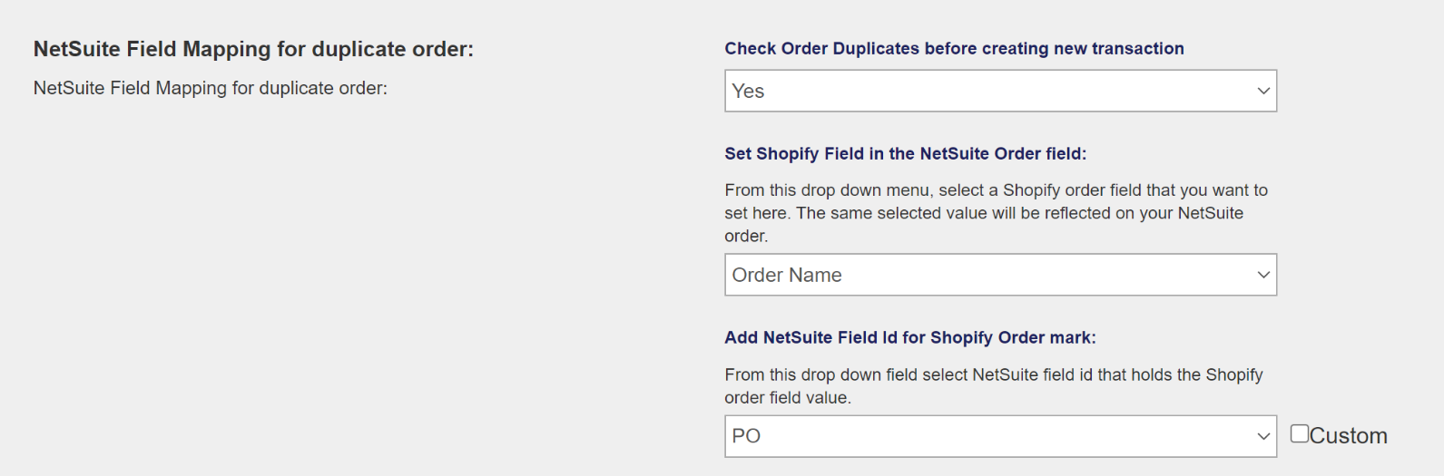 - Check Order Duplicates before creating new transaction - By default, it is selected as No, but select Yes, if you are interested in doing this check before syncing a Shopify order inside your NetSuite account.