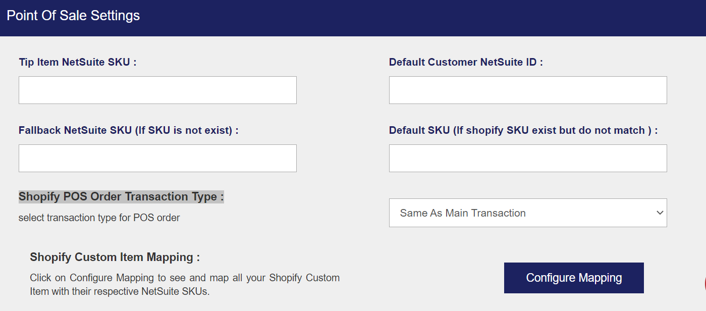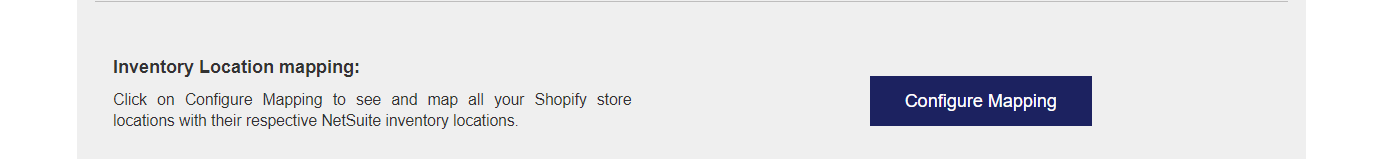 If you want to map a Shopify store location with its respective NetSuite inventory location, please click on the Configure Mapping button, further map the inventory locations. Post mapping, hit the Save button from the bottom of this App Settings section inside our Robust NetSuite Integrator app.