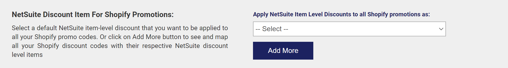 From, this drop-down menu, select a default NetSuite discount that you want to be applied to all your Shopify promo codes. OR click on the Add More button to see and map all your Shopify discount codes with their respective NetSuite discounts.