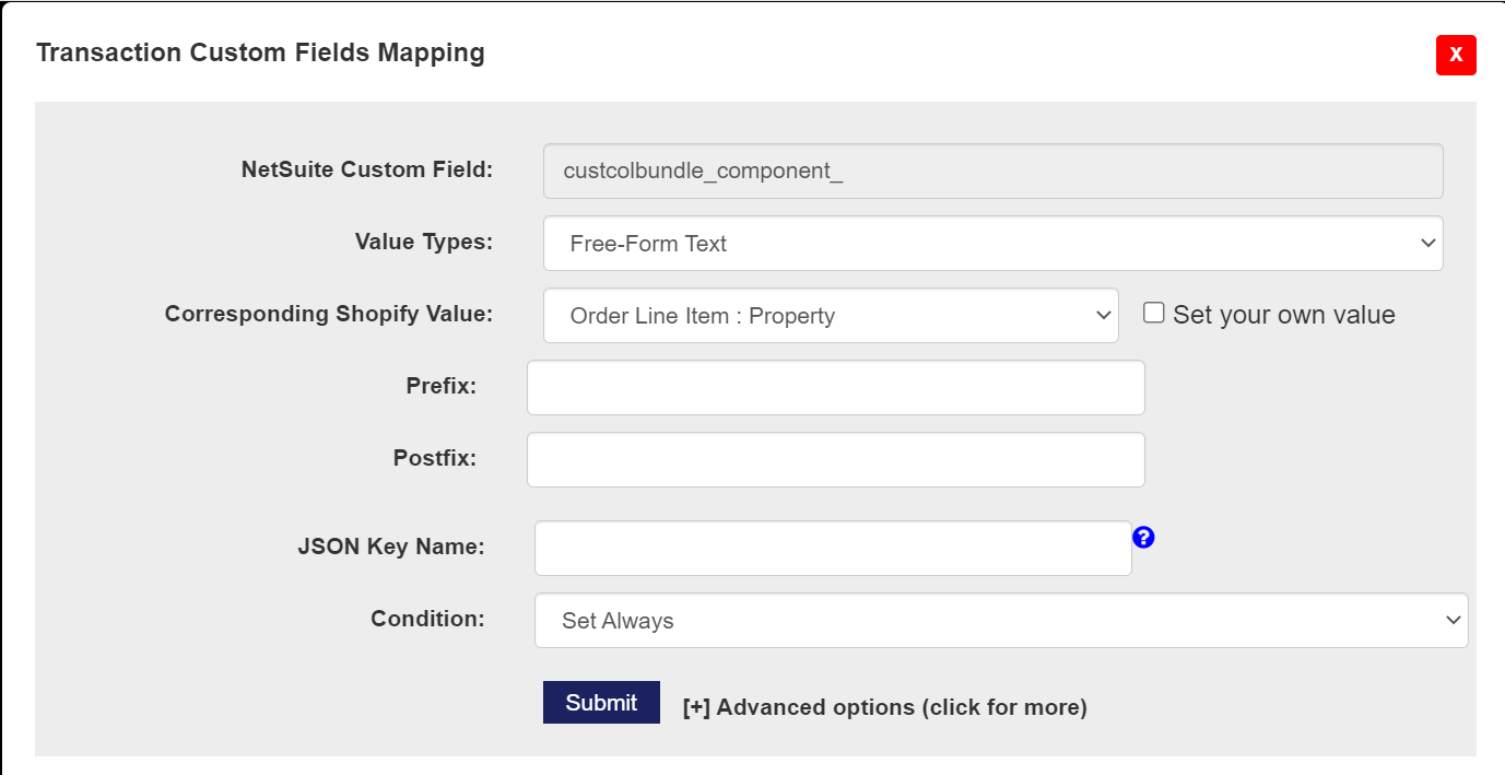 You can always use this menu to (map or sync) advanced-level information such as JSON Key Name, Prefix, Postfix, Value Format, and Condition, between your Shopify store and NetSuite account.