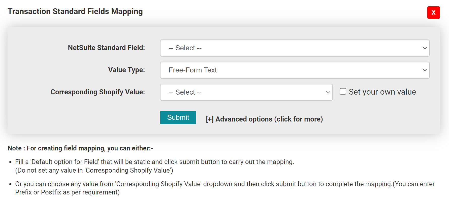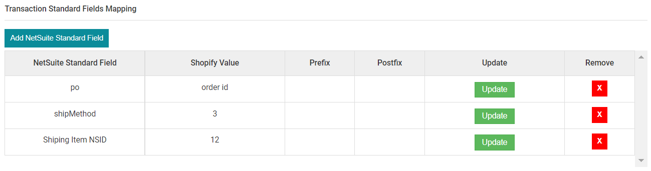 - If you are interested in syncing dynamic values from your Shopify store to your NetSuite account in terms of a standard transaction field, then always map between "NetSuite Standard Field", and "Corresponding Shopify Value" fields. Example: Shopify order ID to NetSuite's standard PO field.