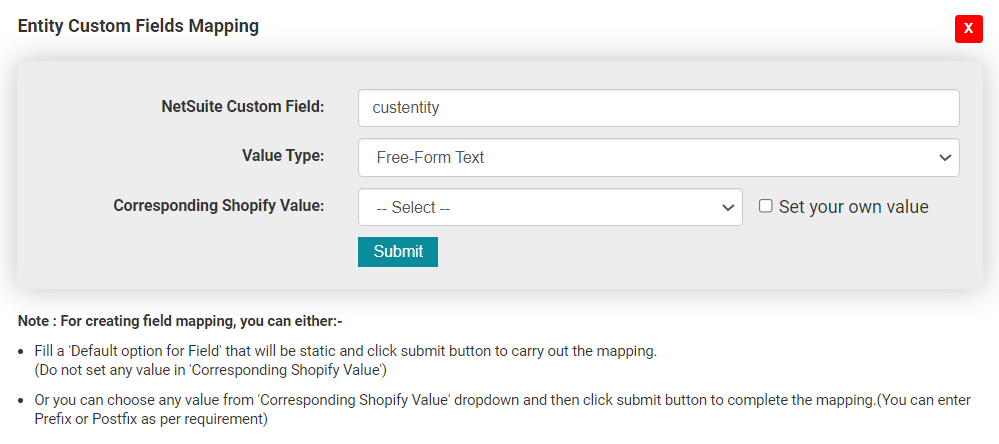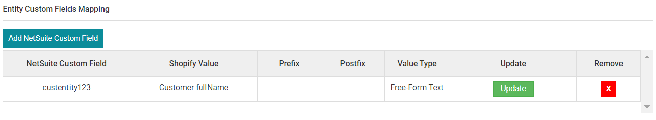 - If you are interested in syncing dynamic values from your Shopify store to your NetSuite account in terms of a custom entity field, then always map between the "NetSuite Custom Field", and "Corresponding Shopify Value" fields. Example: Shopify customer name to NetSuite's custom customer name.