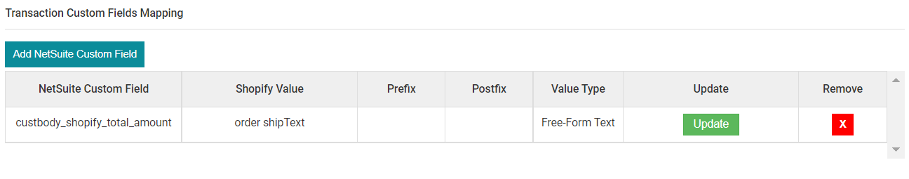 - If you are interested in syncing dynamic values from your Shopify store to your NetSuite account in terms of a custom transaction field, then always map between the "NetSuite Custom Field", and "Corresponding Shopify Value" fields. Example: Shopify order ID to NetSuite's custom PO field.