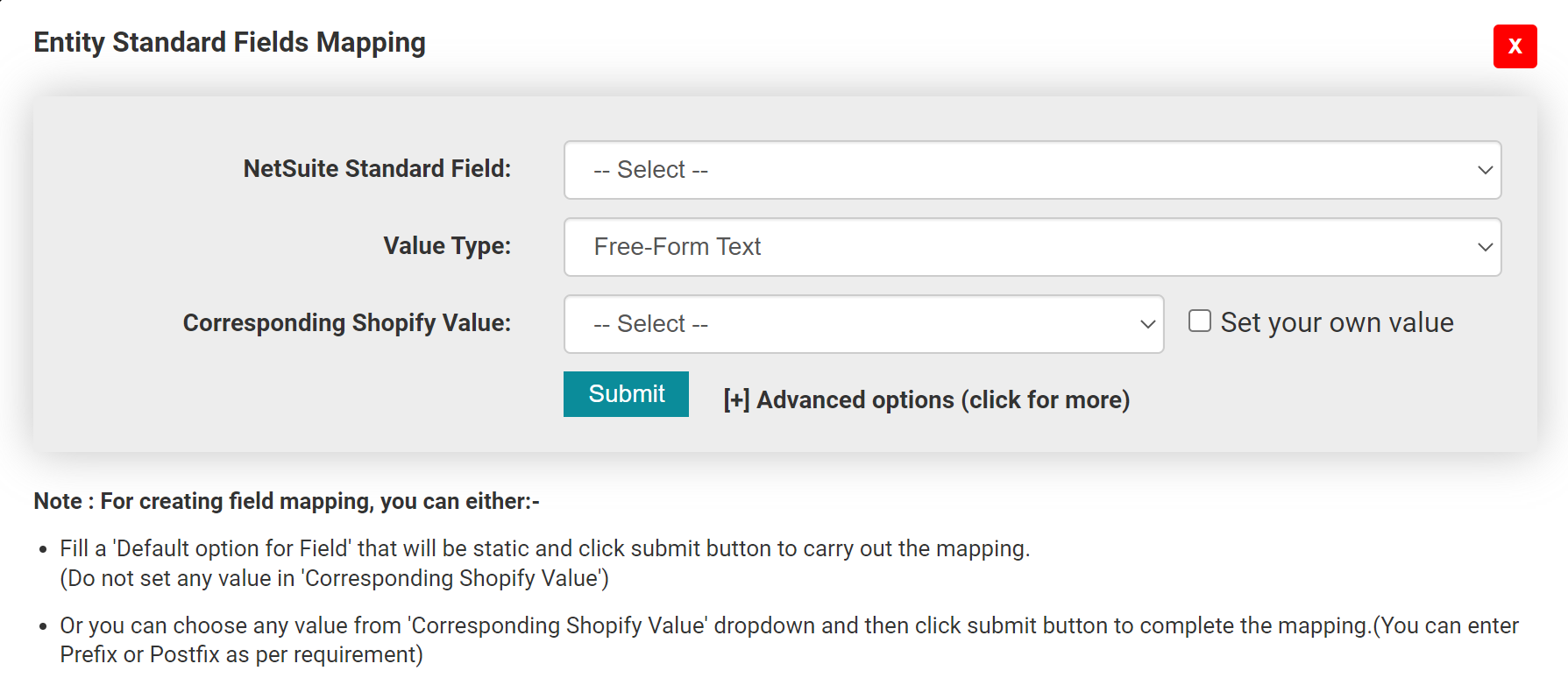 - If you are interested in syncing dynamic values from your Shopify store to your NetSuite account in terms of a standard entity field, then always map between the "NetSuite Standard Field", and "Corresponding Shopify Value" fields. Example: Shopify customer name to NetSuite's standard customer name field.