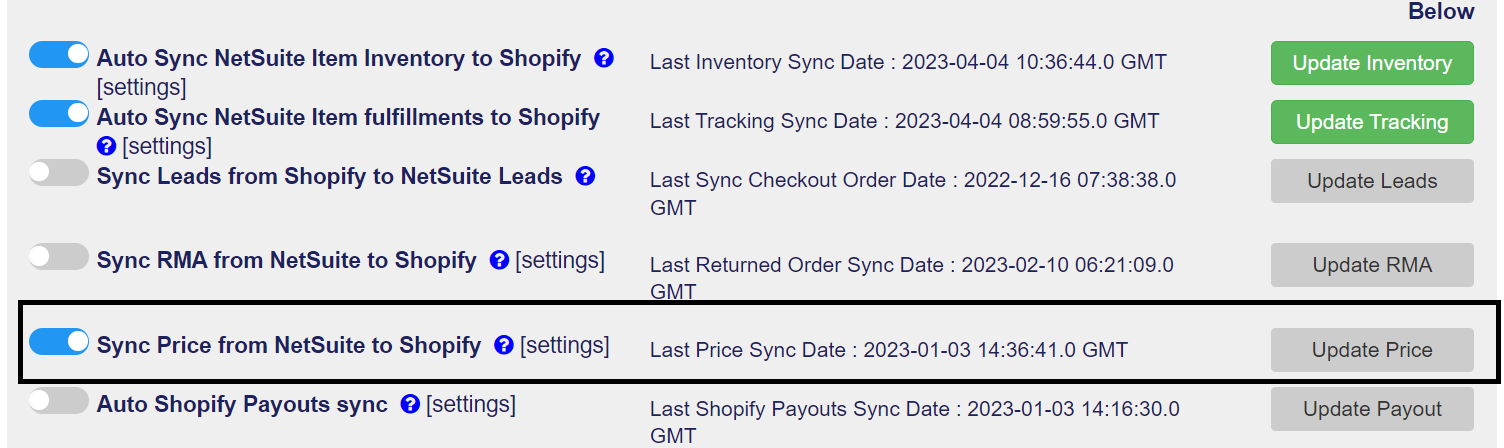 - Enable the toggle for the price sync from NetSuite to Shopify . Click on the settings button it will direct to the configuration settings for Price sync
