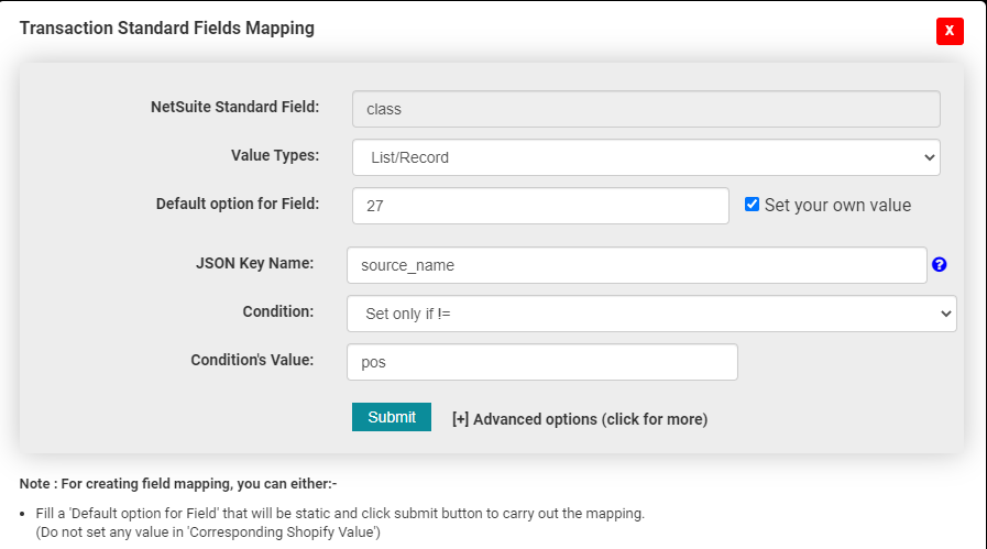 - Condition - Fill this above NetSuite standard field, but only if the order source is not equals to Shopify POS.