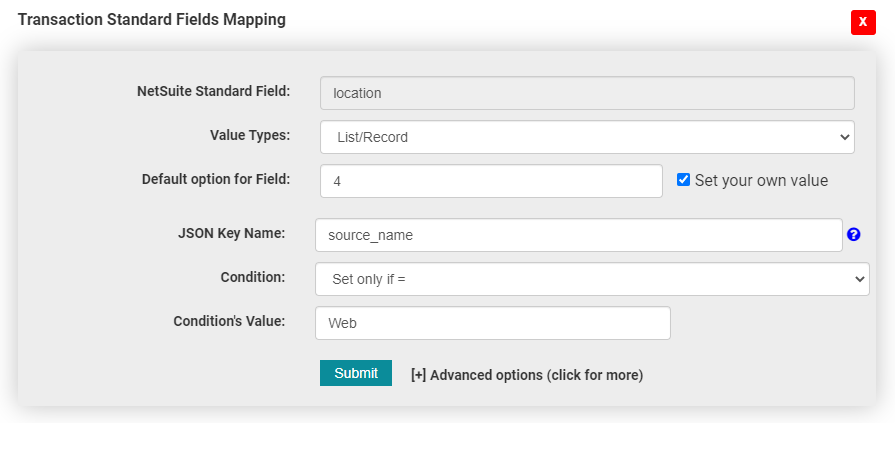 As an example, we want to fill NetSuite's Location field, but only if the Shopify order source is equals to Web.