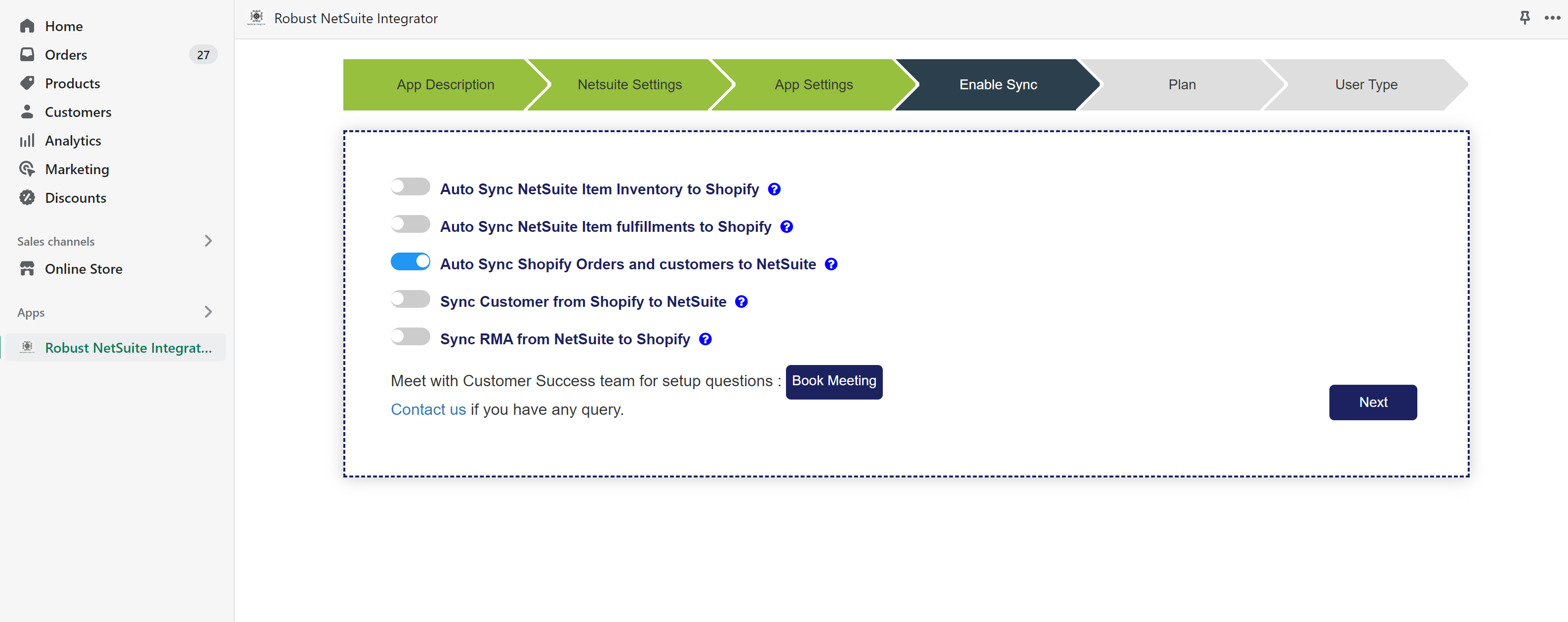 Once, you have configured some of the App settings, you will be asked to review, further turn ON the toggles that you are interested in. For example: If you are interested in syncing your Shopify orders to your NetSuite account turn ON this "Auto Sync Shopify Orders and customers to NetSuite" toggle. Once, you have turned ON all your desired dataflows, click on the Next button. Below is a screenshot to help you understand this visually.