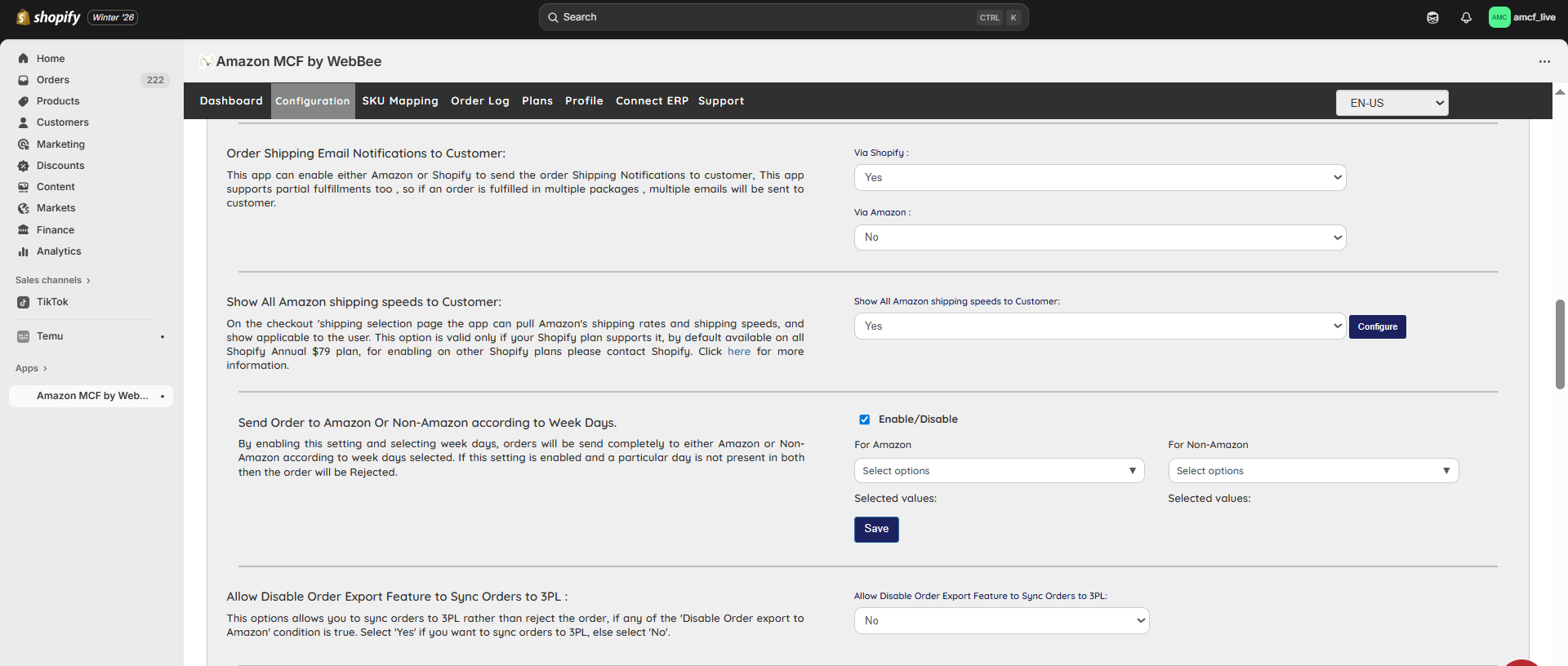 Configuration Page Overview: Shopify - Auto Multi-Channel fulfillment app