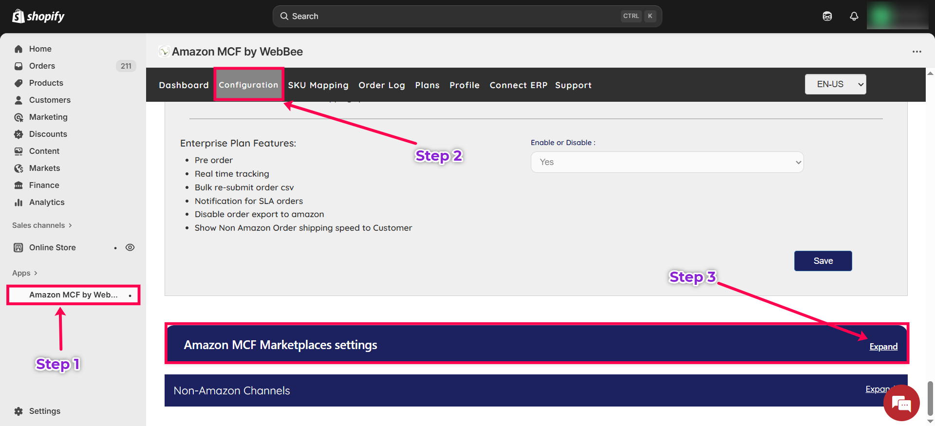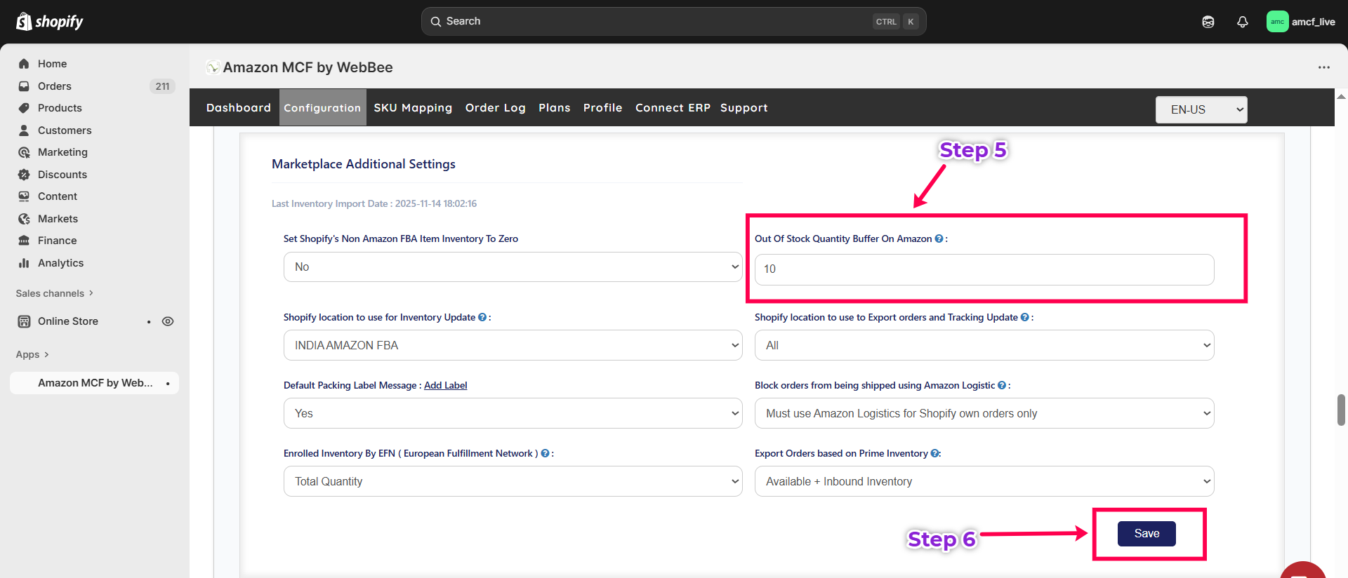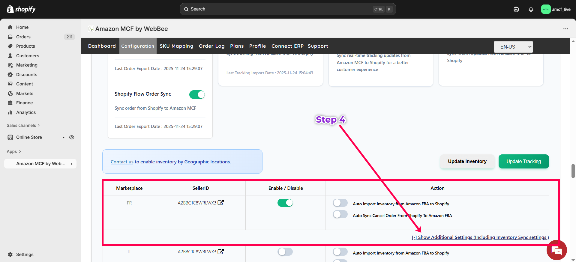 Note: These settings only work for active marketplaces in the Webbee AMCF Shopify app.