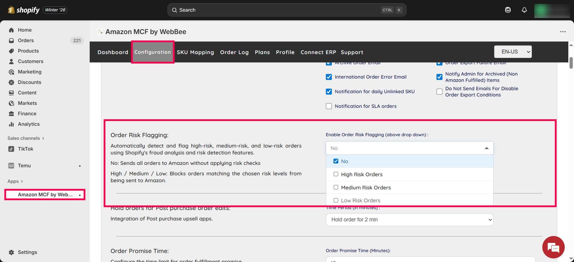 Shopify's algorithm classifies orders as high-risk, medium-risk, or low-risk, so if you don't want our Shopify Auto Multi-Channel Fulfillment app to send them to your Amazon FBA marketplaces for fulfillment, follow the steps below.