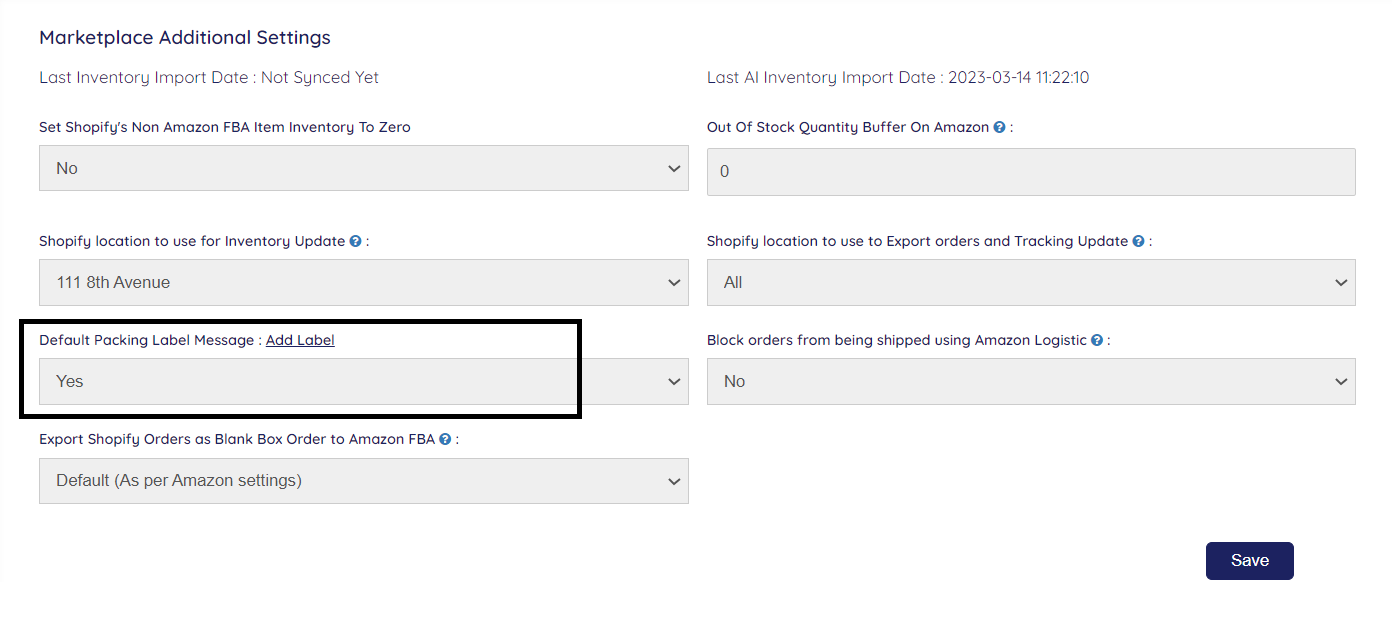 - Scroll down to the Default Packing Label Message drop-down menu, and select Yes, and hit the Save button, If you want to print one standard message on all your Amazon packing slip comments.