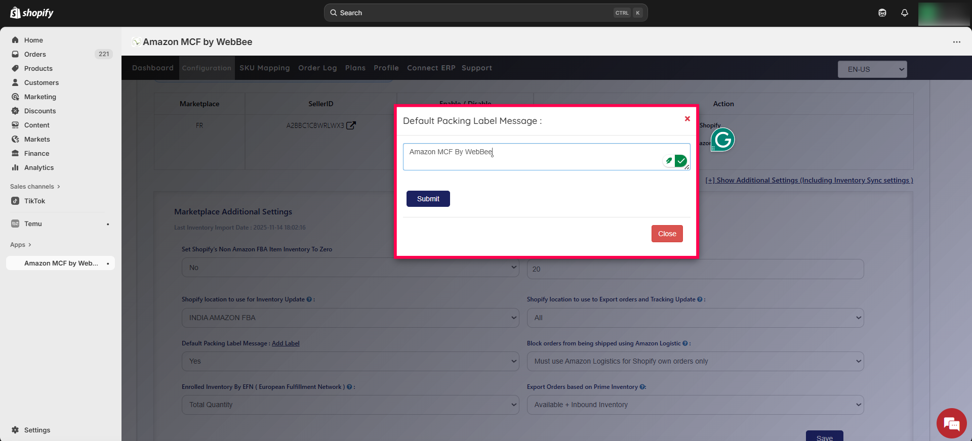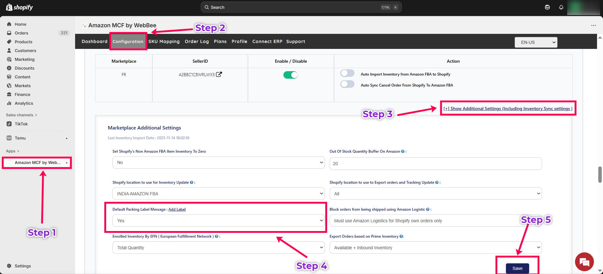 Navigate to the Apps section of your Shopify store and select Amazon MCF by WebBee. Navigate to the Configuration Page > Marketplace Settings > Show Additional Settings (including Inventory Sync Settings).