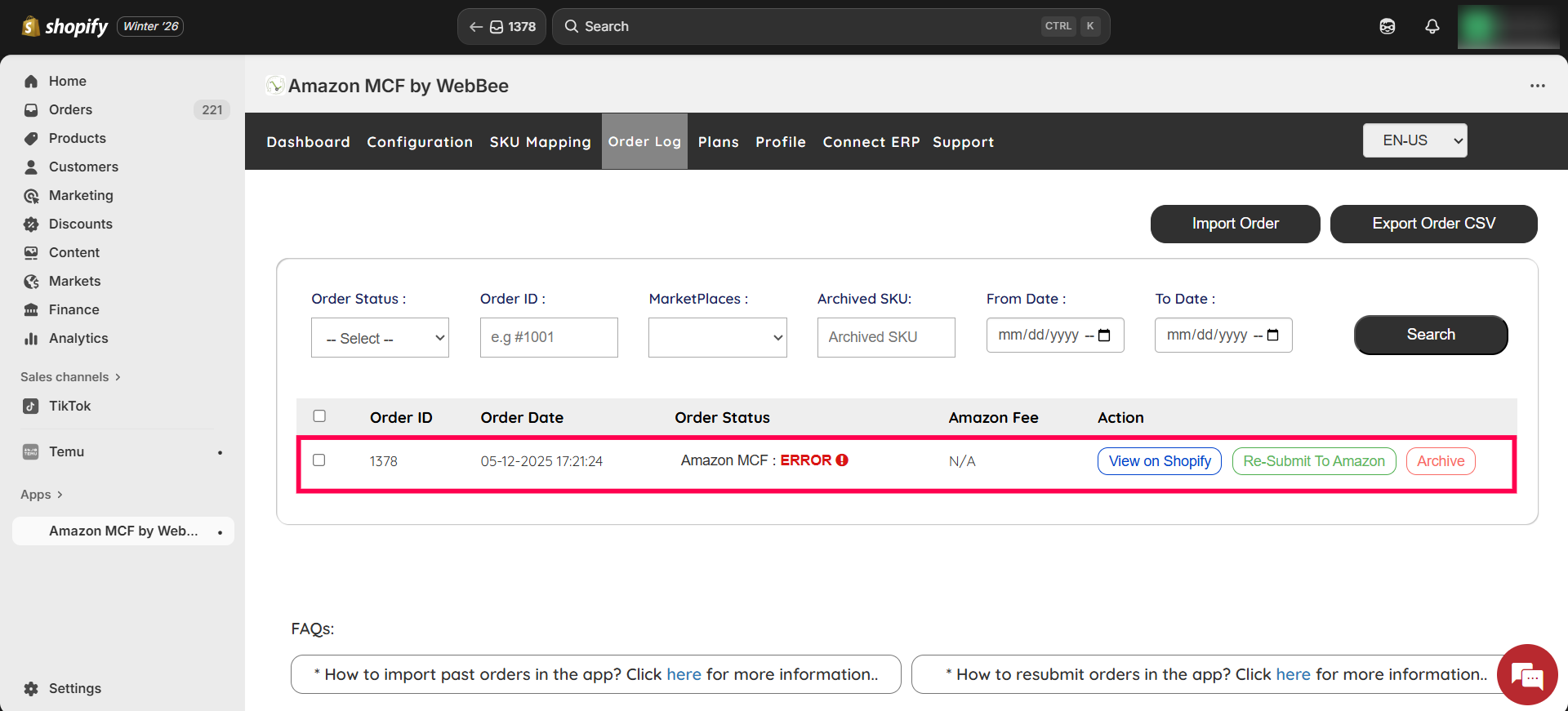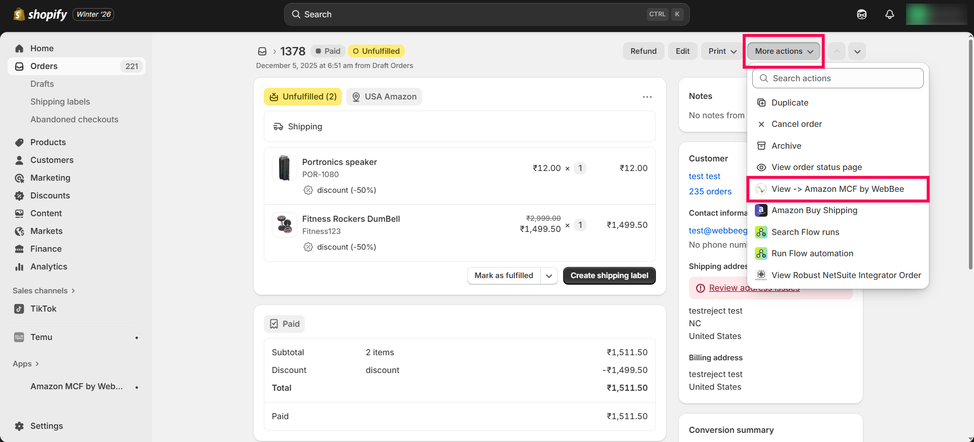 Open any order inside Shopify, tap on the "More actions" menu, and click on View->Amazon MCF by WebBee link. Below is a screenshot just to help you understand this visually.