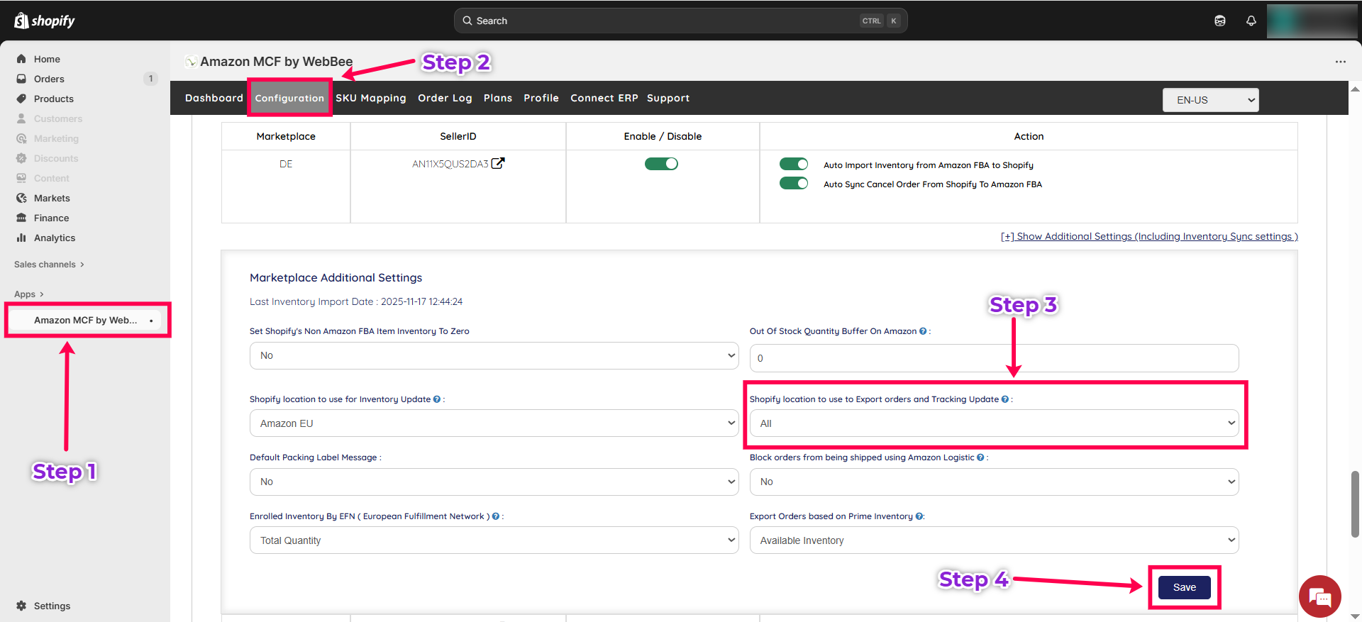 3. If a specific location / FBA location is selected, it will allow Shopify orders to sync via our app to Amazon FBA and get them fulfilled from that FBA location (from the selected location assigned to orders in Shopify). Orders for locations assigned would be rejected with the message "Shopify location is not mapped for this order".