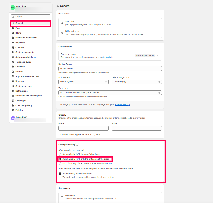 In Shopify settings, go to the General section and scroll down to the Order processing section. Under the "After an order has been paid" setting, select "Automatically fulfill only the gift cards of the order" and then click the Save button.