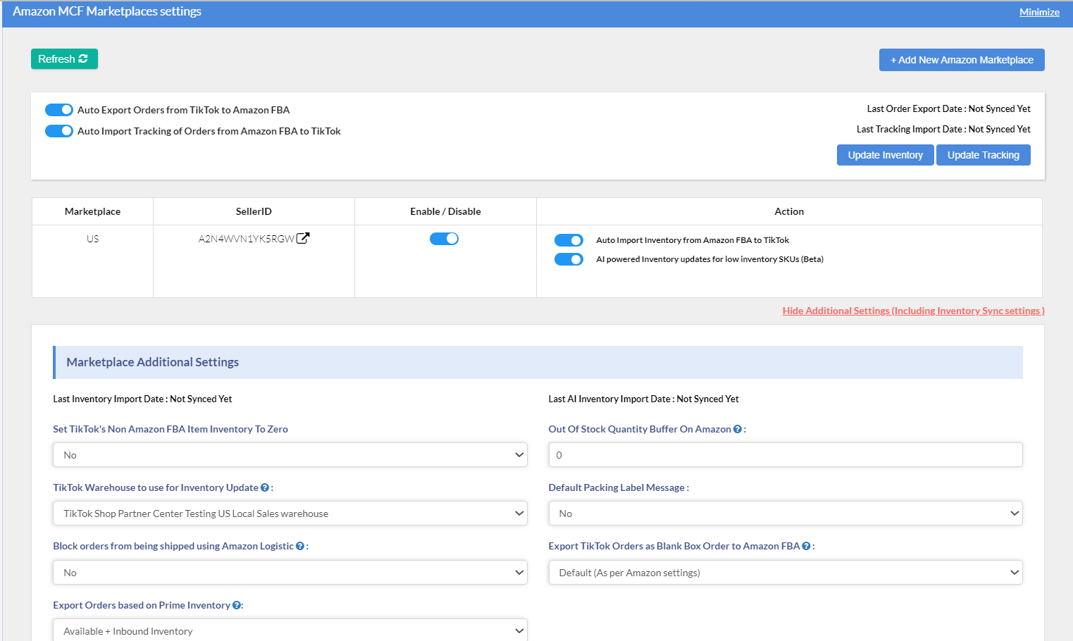 If you have turned on this toggle, then we will start importing order related tracking information from your Amazon FBA to your TikTok store. Last Tracking Import Date: Shows the last time this synchronization had happened.