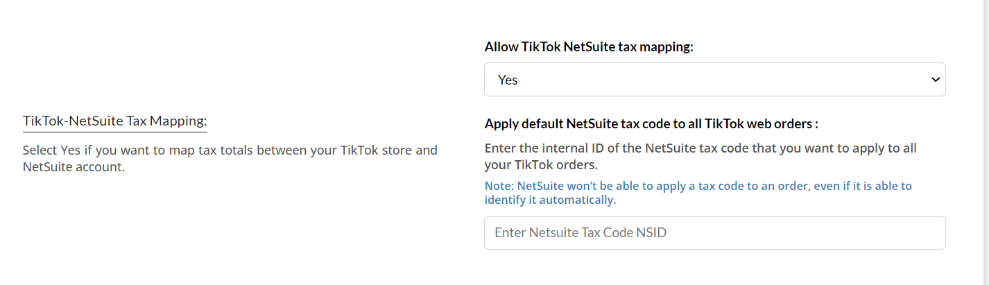 By default, it is set to No, but select Yes if you want to map tax totals between your TikTok store and NetSuite account. If you select, Yes you need to enter the internal ID of a NetSuite tax code that you want to apply to all your TikTok web orders. Note: NetSuite won’t be able to apply a tax code to an order, even if it is able to identify it automatically.