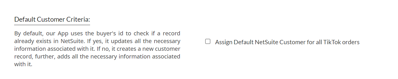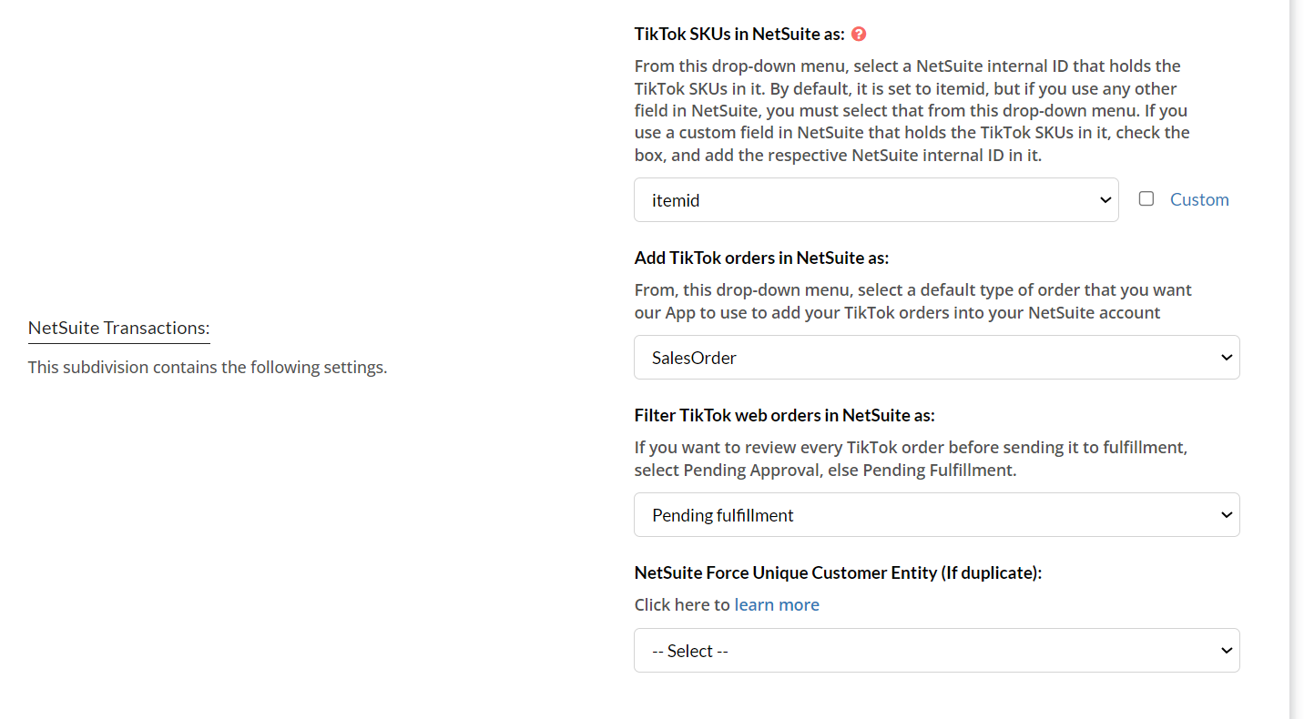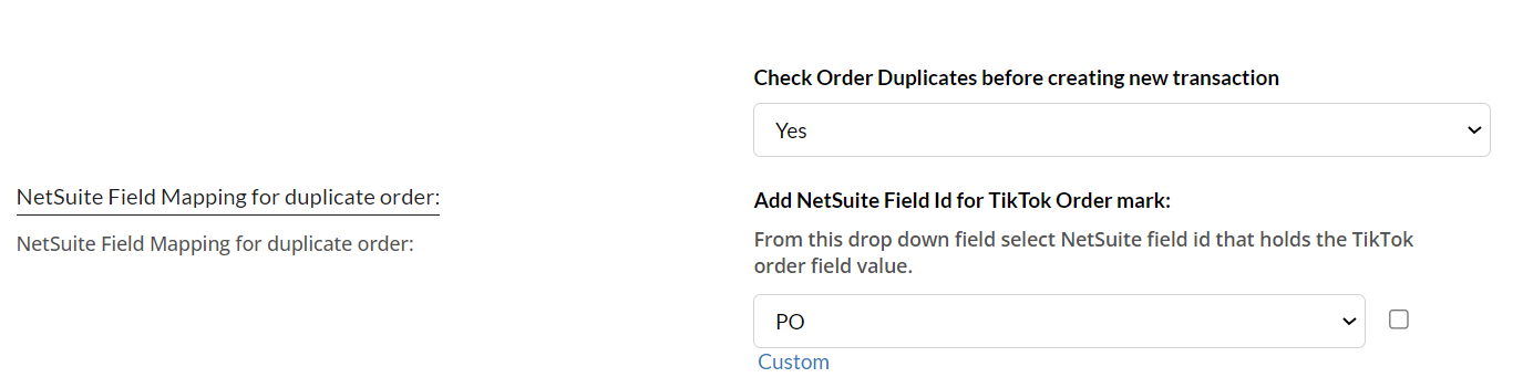 - Check Order Duplicates before creating new transaction - By default, it is selected as No, but select Yes, if you are interested in doing this check before syncing a TikTok order inside your NetSuite account.