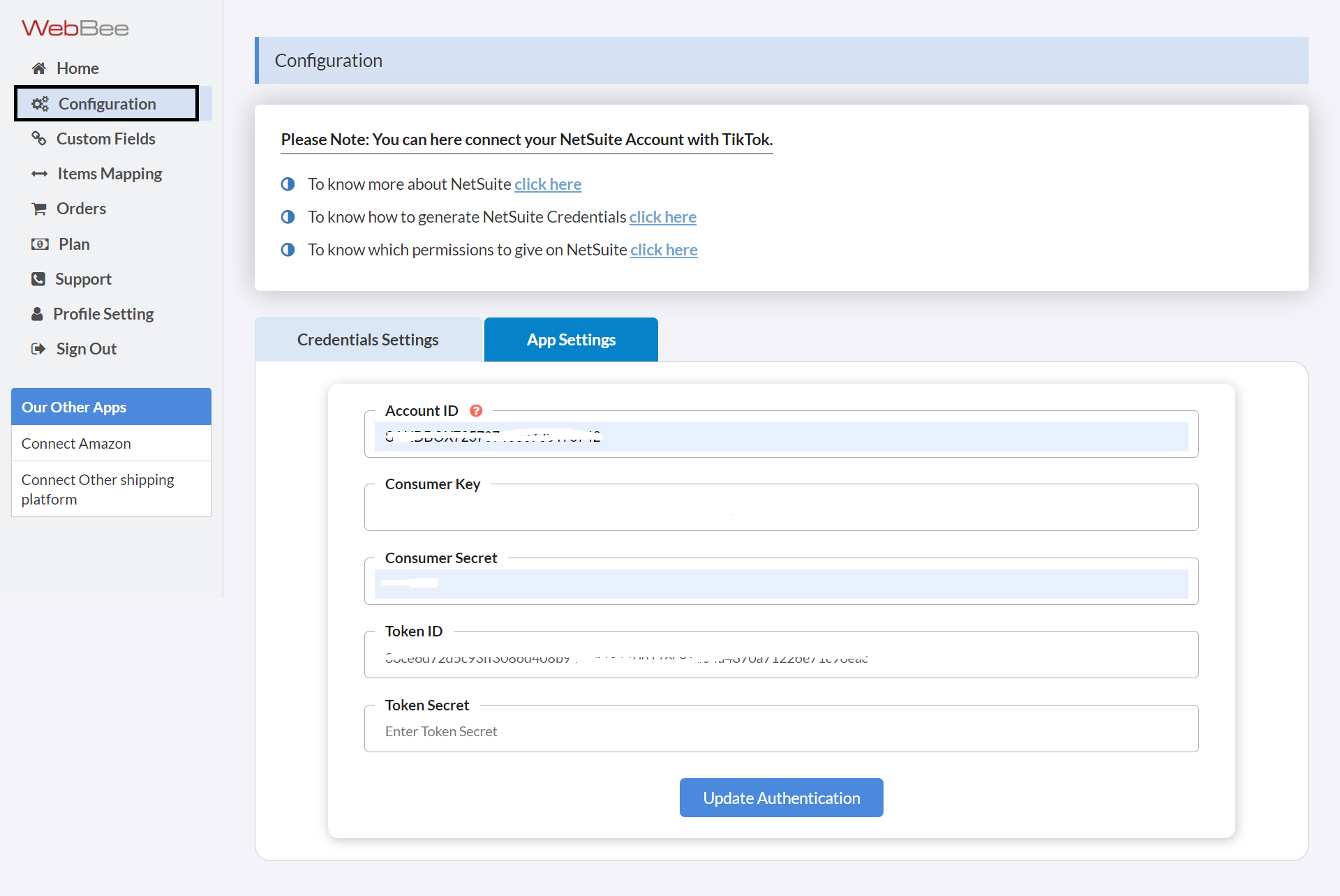The section holds mandatory credentials such as Account ID, Consumer Key, Consumer Secret, Token ID, and Token Secret that our app needs to connect with your NetSuite account.