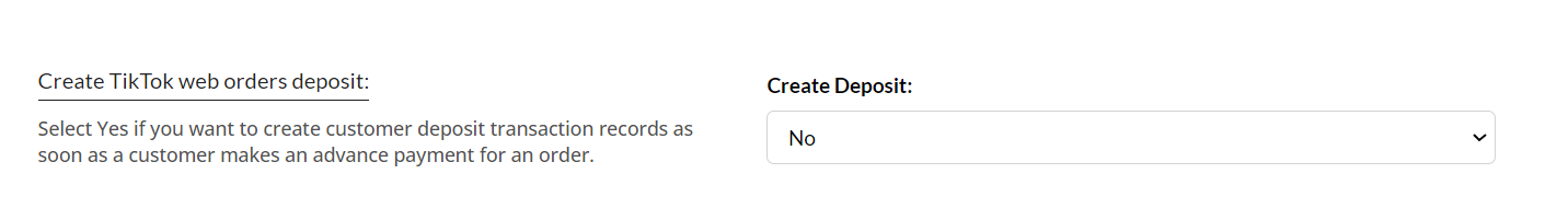 By default, it is set to No, but select Yes if you want to create a customer deposit record inside NetSuite as soon as a TikTok customer makes an advance payment for an order. To learn, how to configure a Customer Deposit record in your NetSuite account of your TikTok customer using the Robust NetSuite Integrator app, please click here.