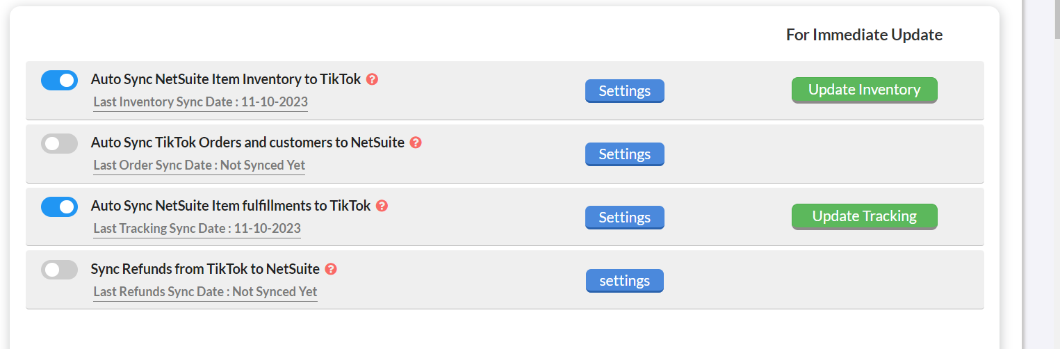 - Update Tracking Number Options: By default, our integrator will mark an order as "Fulfilled" inside Tiktok , if it is able to find, further sync an item fulfillment record of the all shipments back to Tiktok , but if you are interested in marking an order as "Fulfilled" inside TikTok, even if there is no item fulfillment record, then please select this "Immediately (with or without) tracking number" option.