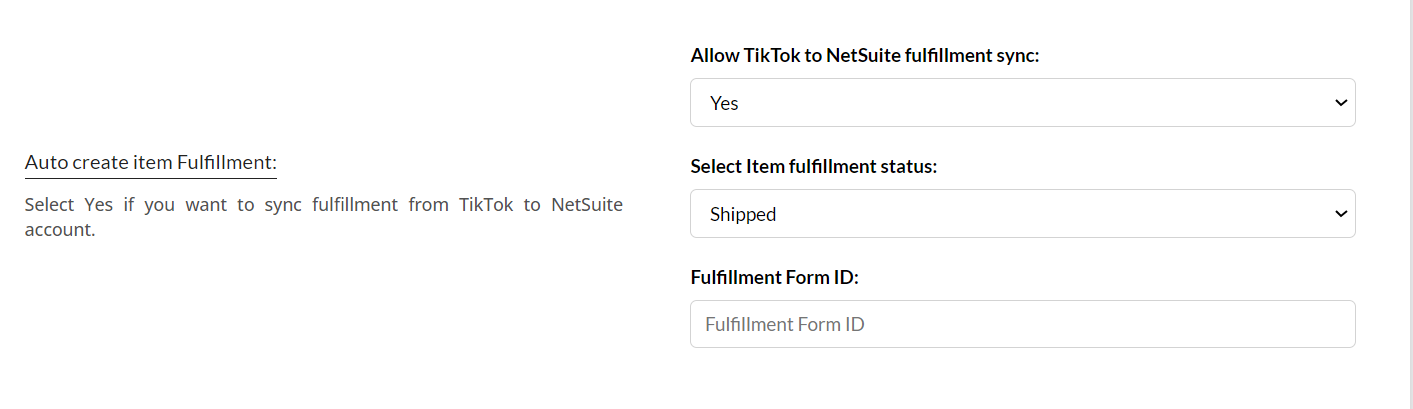 - Allow TikTok to NetSuite fulfillment sync - By default, it is selected as No, but select Yes, if you are interested in syncing a TikTok fulfillment record inside a NetSuite transaction under its Related Records sub-tab.