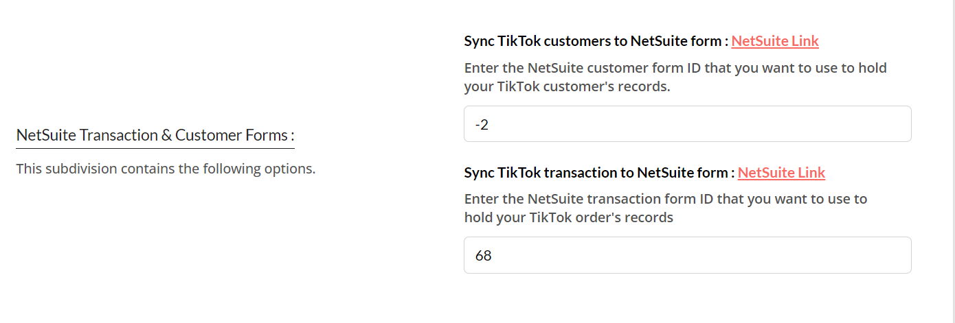 Here, enter the NetSuite transaction form ID that you want to use to hold your TikTok order’s records.