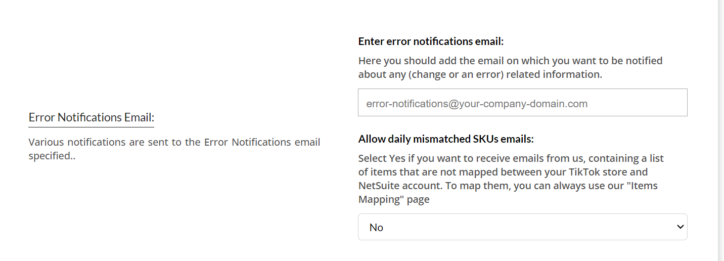 Select Yes if you want to receive emails from us, containing a list of items that are either not mapped between your TikTok store and NetSuite account OR duplicate inside your TikTok store. To map them, you can always use our "Product Linking" page.