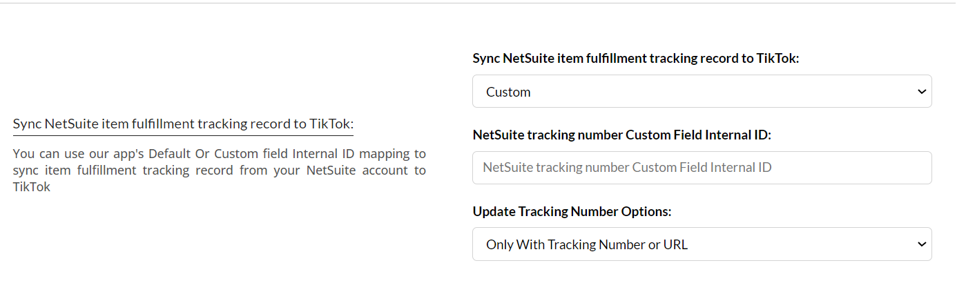 - Sync NetSuite item fulfillment tracking record to TikTok : You can use our app's Default OR Custom field Internal ID mapping to sync item fulfillment record from your NetSuite account to your Tiktok store. By default, it is set to "Default" i.e. NetSuite's default item fulfillment record. In case, you are (capturing / storing) item fulfillment records at a custom field, select "Custom" from the drop-down menu, further enter the internal ID of this custom field.