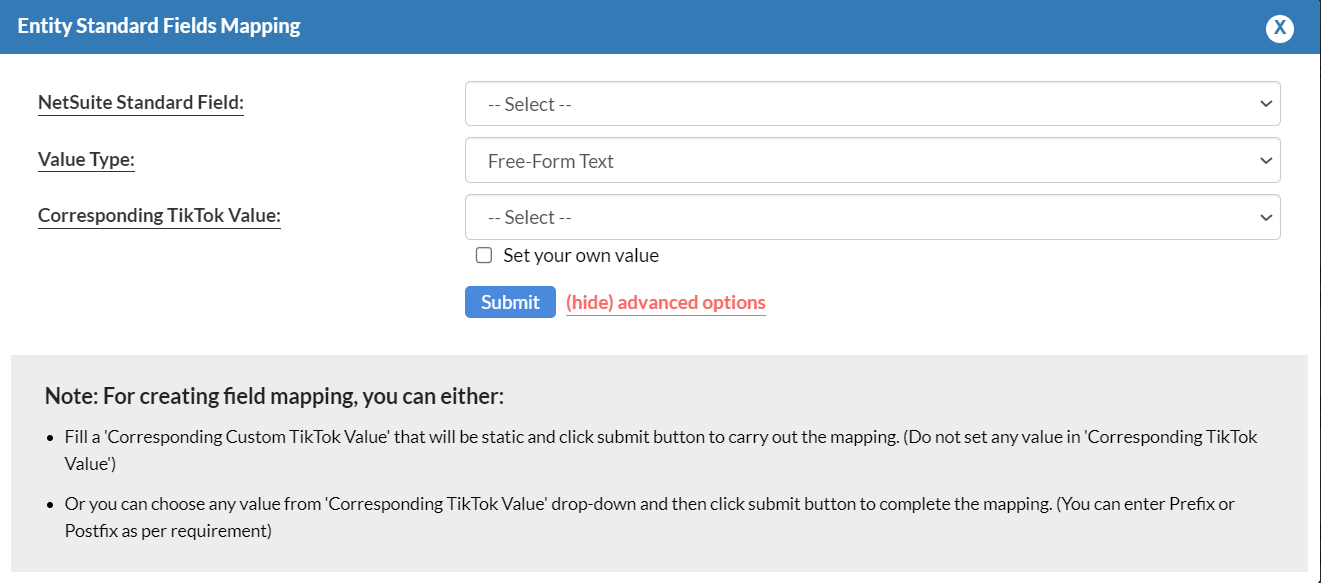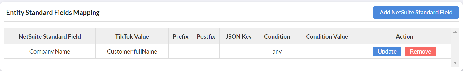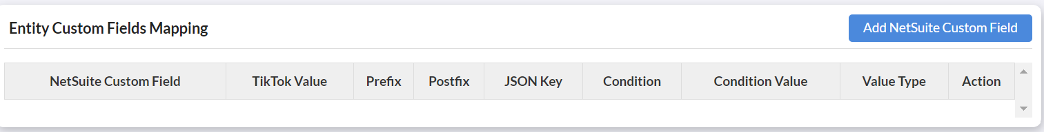 - If you are interested in syncing dynamic values from your TikTok store to your NetSuite account in terms of a custom entity field, then always map between the "NetSuite Custom Field", and "Corresponding TikTok Value" fields. Example: TikTok customer name to NetSuite's custom customer name.