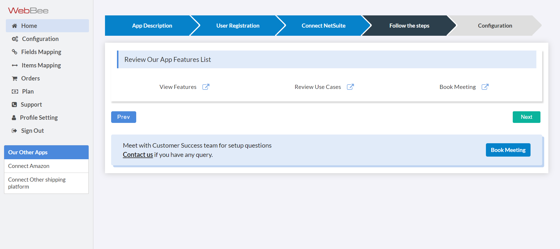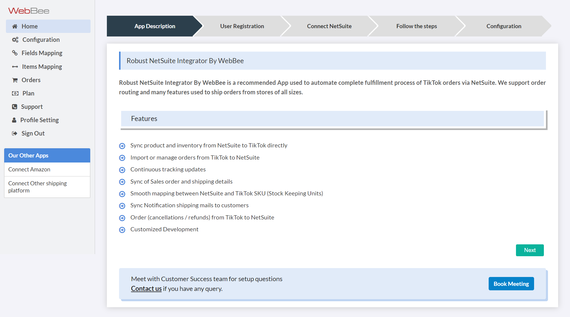 First of all, thanks for giving our integrator a try to sync all your desired dataflows between your TikTok store and NetSuite account. Below is an overview of what onboarding our integrator looks like.