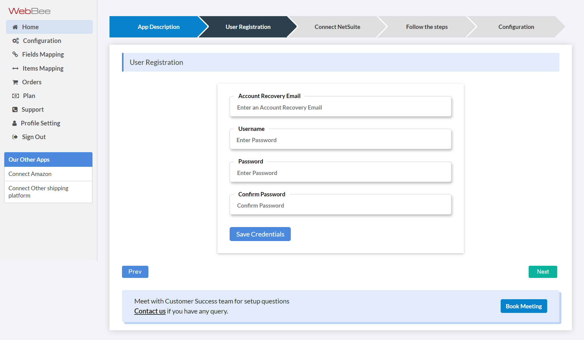 After clicking the Next button, you will be asked to create the User Credentials for the TikTok Robust NetSuite Integrator application. You need to enter your Account Recovery Email, Username, and Password and Save Credentials. Below is a screenshot to help you understand this visually.