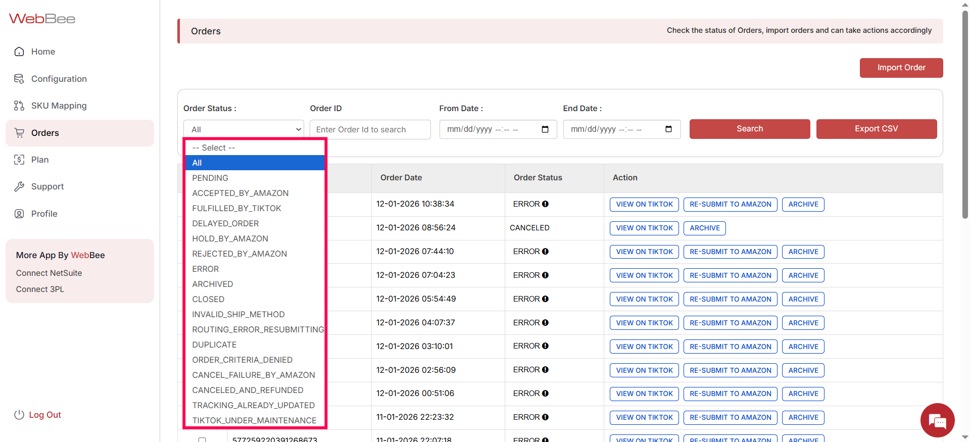 - Order Table: To view detailed information, including order ID, order statuses, and various actions, i.e., view on TikTok, resubmit to Amazon, or archive.
