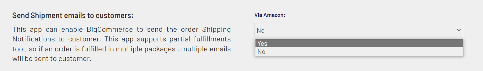 - To send these tracking numbers to your customers, all you have to do is to configure this "Order Shipping Email Notifications to Customer" setting inside our app's Configuration Page > Apps Settings section. If you want to send shipping emails via Amazon, select YES inside it. Please make sure to hit the Save button after making any changes in this OR any other section.