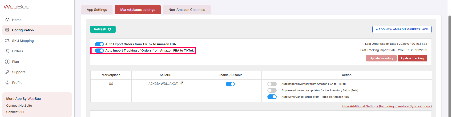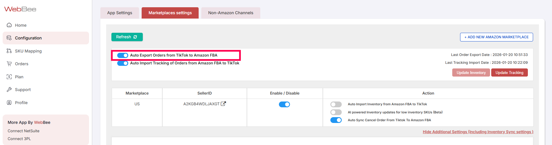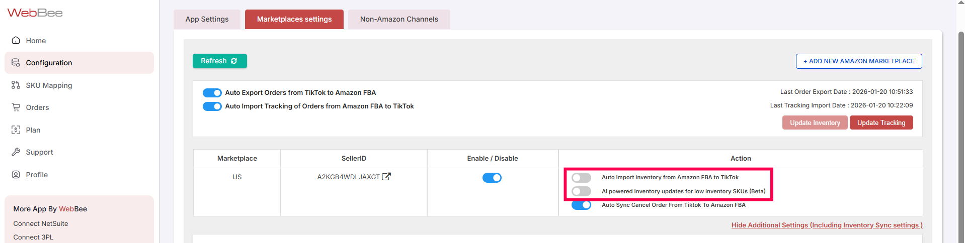 - Go to the Configuration Page > Marketplace Settings, and turn on the Auto Import Inventory from Amazon FBA to TikTok toggle