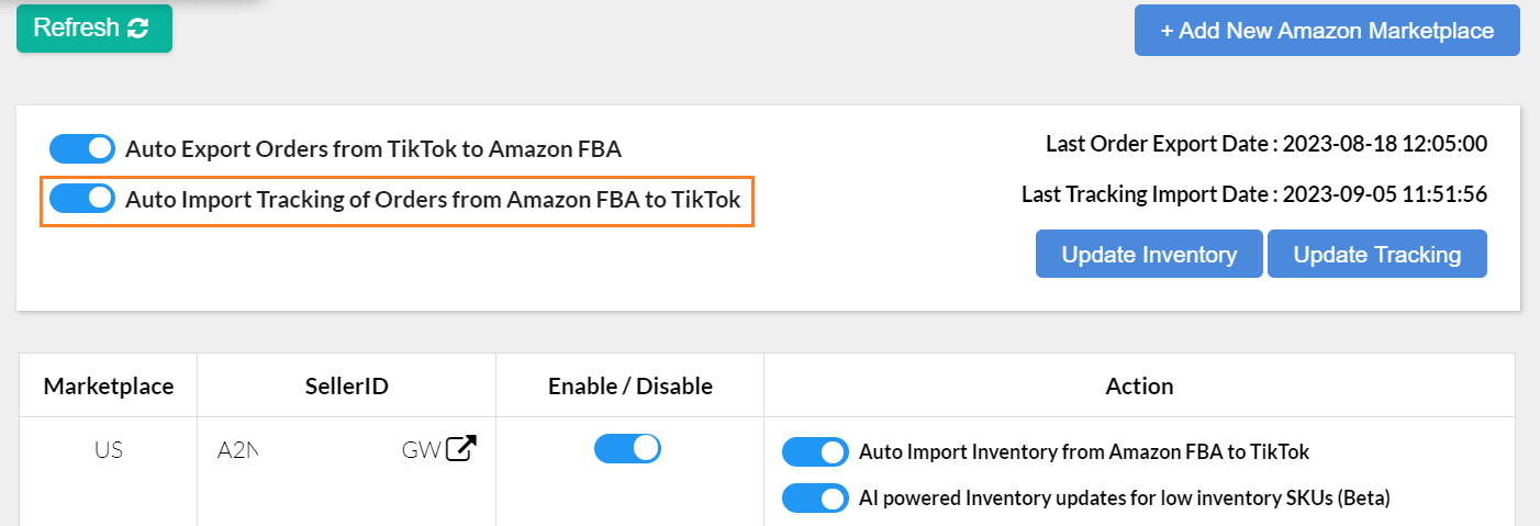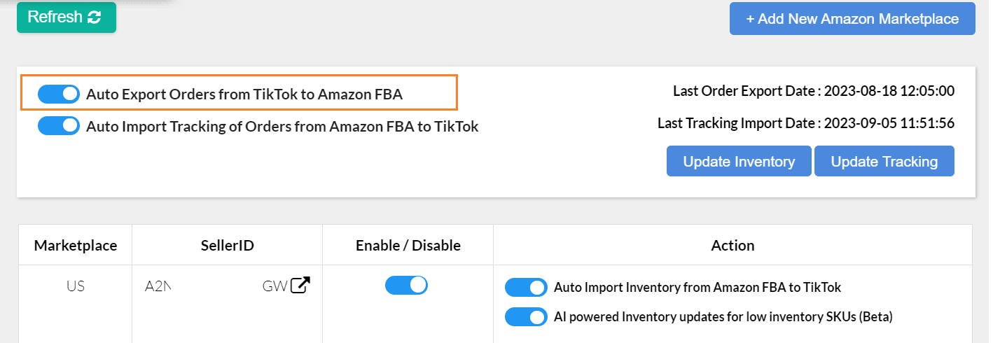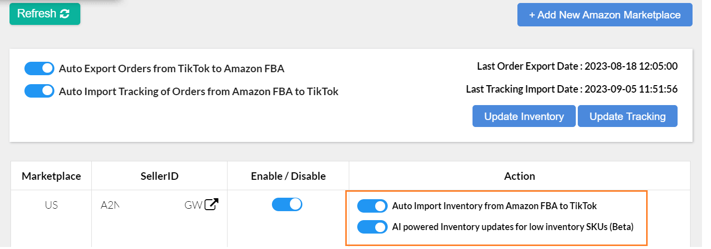 - Go to the Configuration Page > Marketplace Settings, and turn on this Auto Import Inventory from Amazon FBA to TikTok toggle