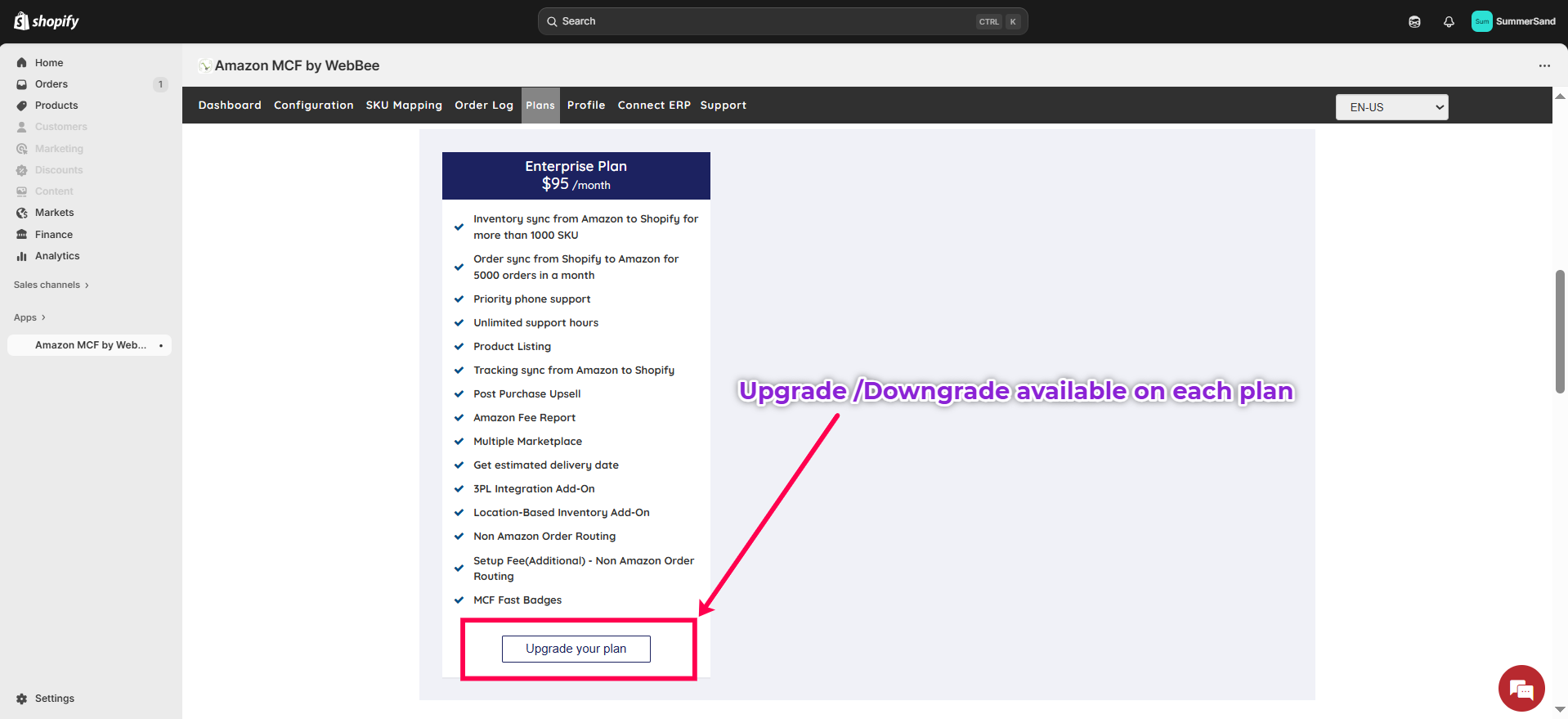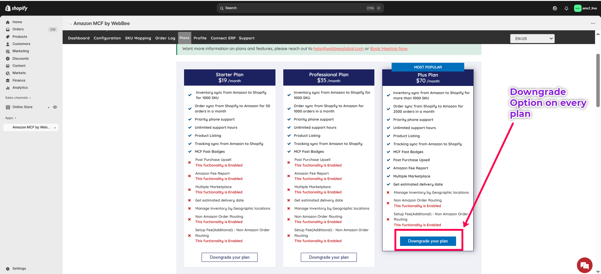 How do I upgrade or downgrade my current plan in AMCF Shopify.
