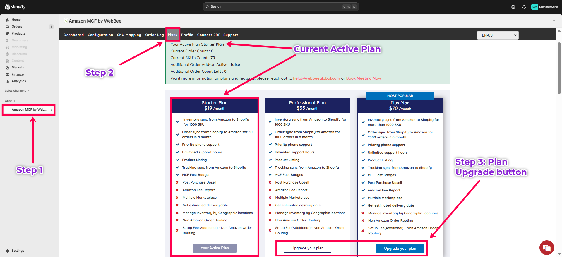 Error: "Your SKU's count is more than 1000" and a prompt to upgrade the plan. However, you only have lesser FBA SKUs in your Shopify store.