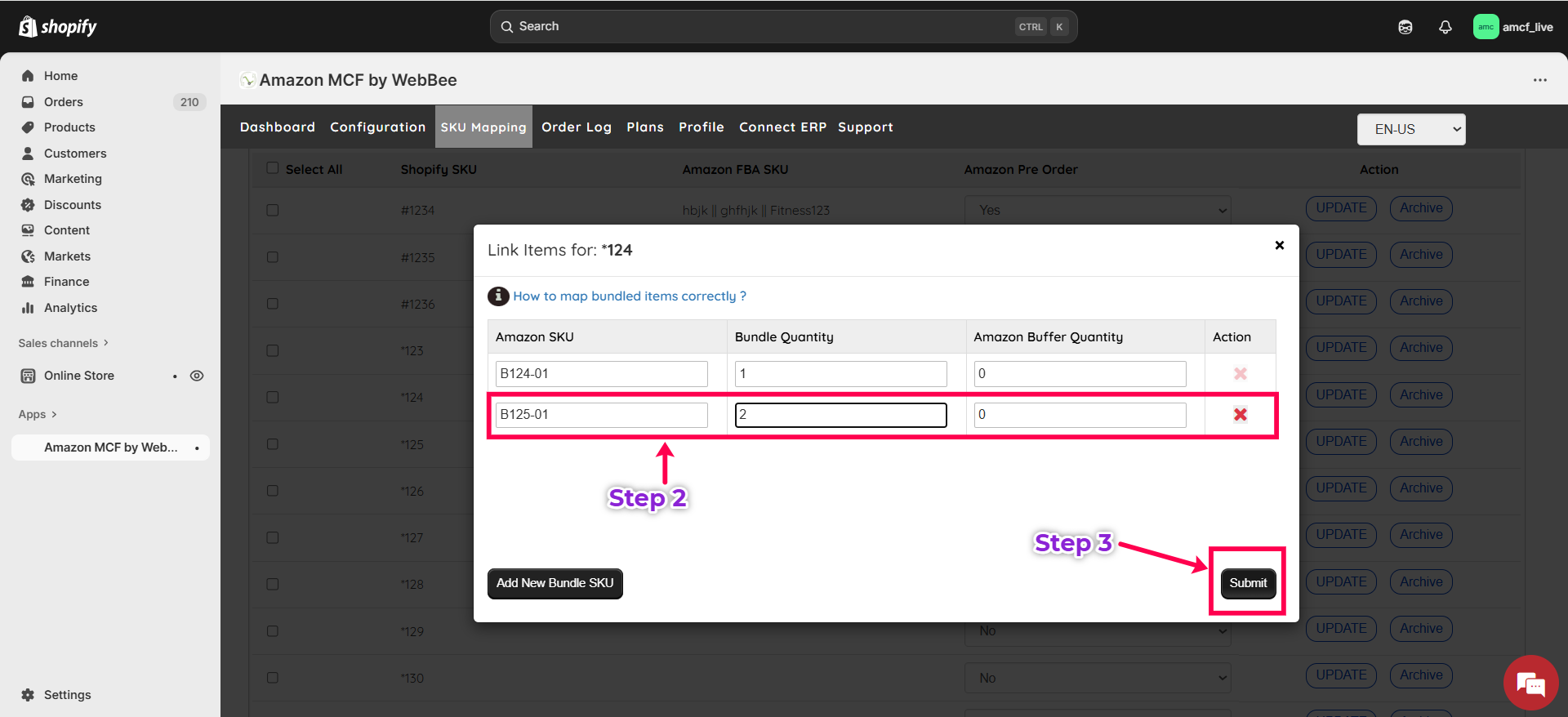 Once you click the Update button, you will see a pop-up; make sure the Amazon FBA SKU is mapped. Now, for example, if you are interested in shipping 03 units of your desired Amazon SKU, enter 03 in the "Bundle Quantity" field. Finally, click on the Submit button.