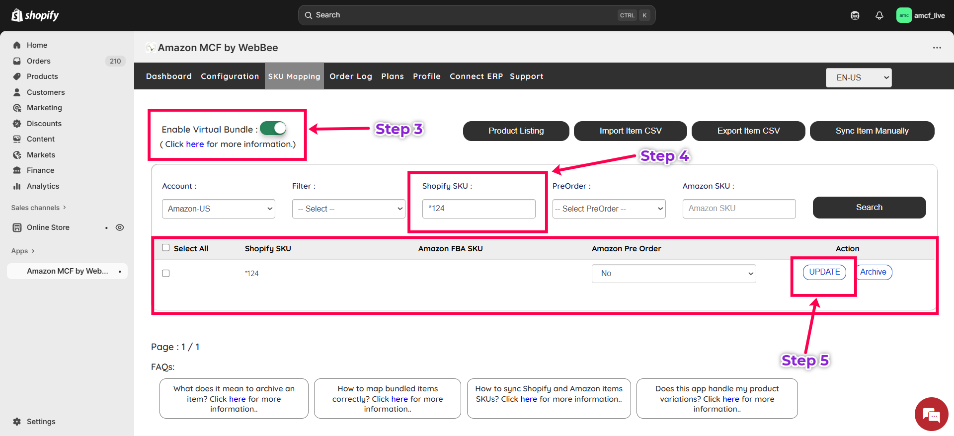 On the "SKU Mapping" page, turn on the "Enable Virtual Bundle" toggle to create/edit bundles. Now, using the Shopify SKU search field, enter the SKU that you want to ship in more than one quantity. Once you have your search result, click on the Update button corresponding to the desired SKU.