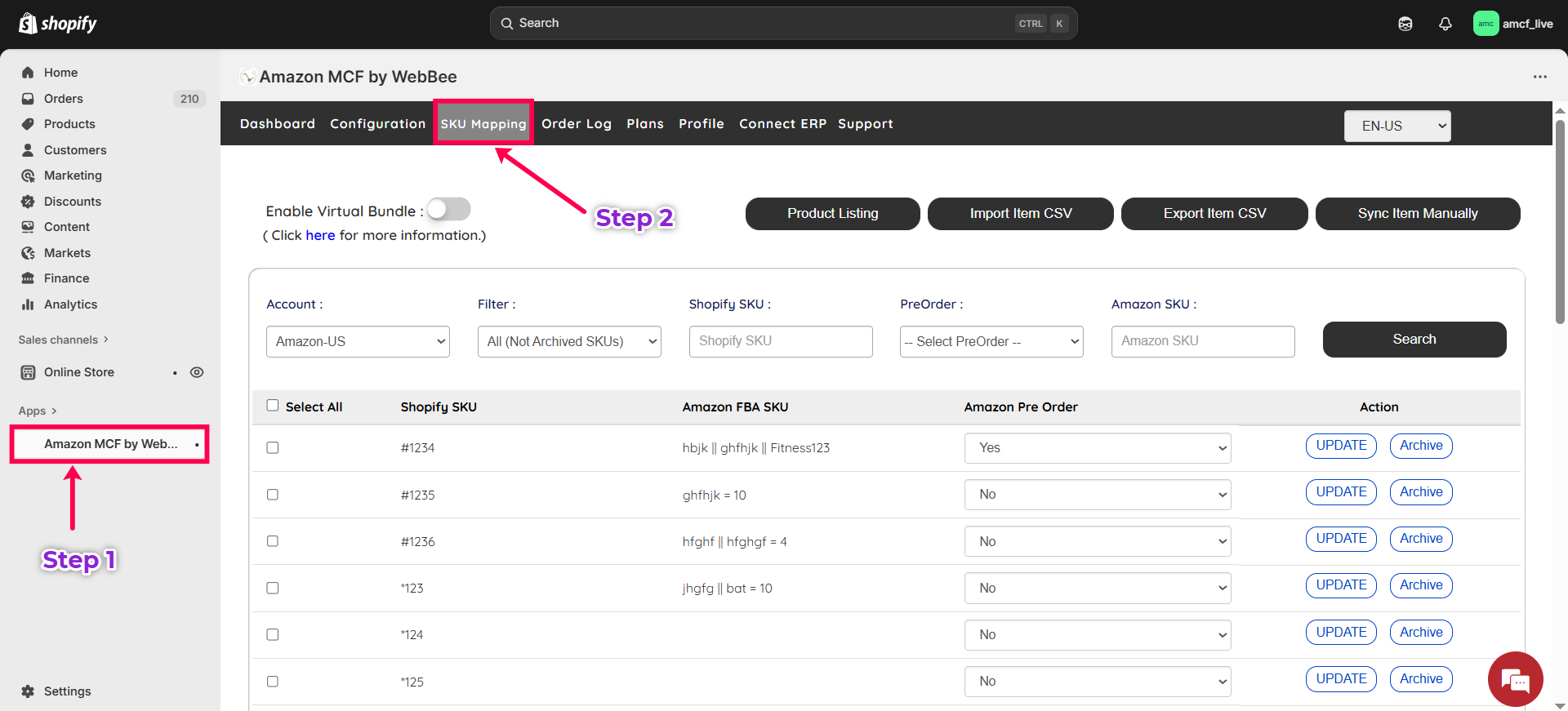 Open your Shopify store, go to the Amazon MCF by Webbee app and click on the "SKU Mapping" page.