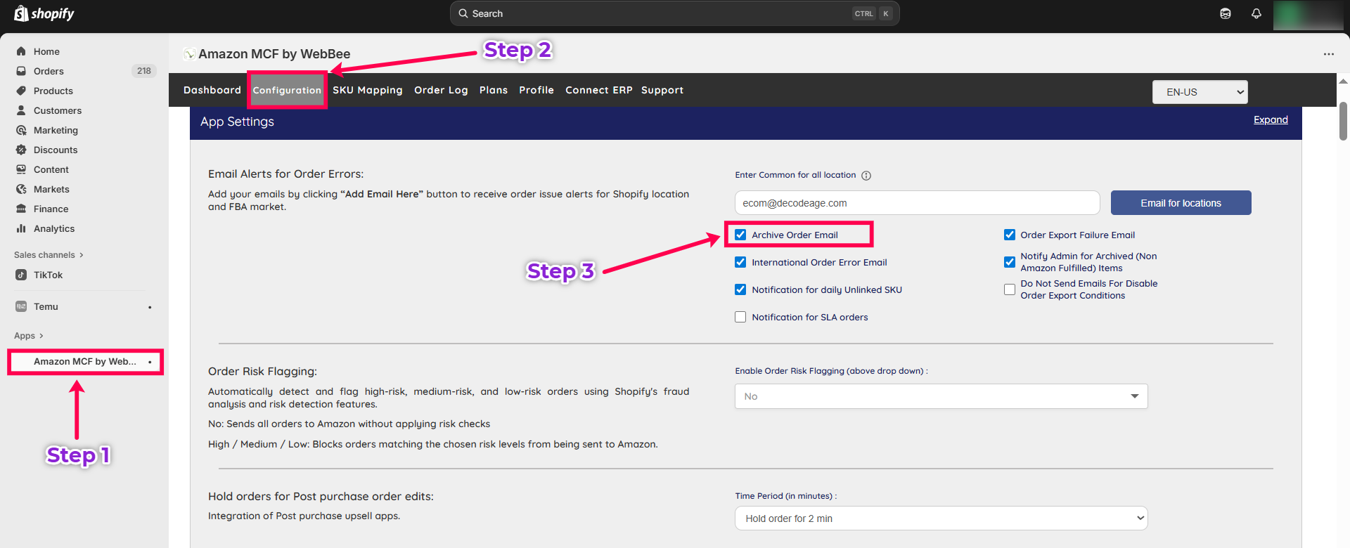 Archive an SKU/Item in Amazon MCF Shopify WebBee App.